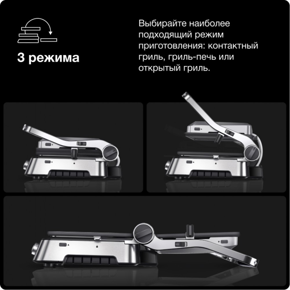 Электрогриль Braun CG9047 позволяет приготовить любые продукты: стейки, колбаски, гамбургеры, овощи или рыбу. Использование прибора простое и понятное: вся необходимая информация указана на дисплее. Эта модель работает в трех режимах: контактный гриль (с закрытой крышкой), открытая жаровня (крышка откинута) и «гриль-печь» (верхняя панель приподнята над нижней). Температура нагрева задается в диапазоне от 60 до 230 градусов отдельно для каждой поверхности при помощи поворотных регуляторов. Прибор оповестит о готовности к работе звуковым сигналом – пора приступать к закладке продуктов! Электрогриль оснащен нагревательными элементами с двух сторон, что обеспечивает равномерную прожарку блюд и румяную корочку. Наклон крышки можно регулировать.