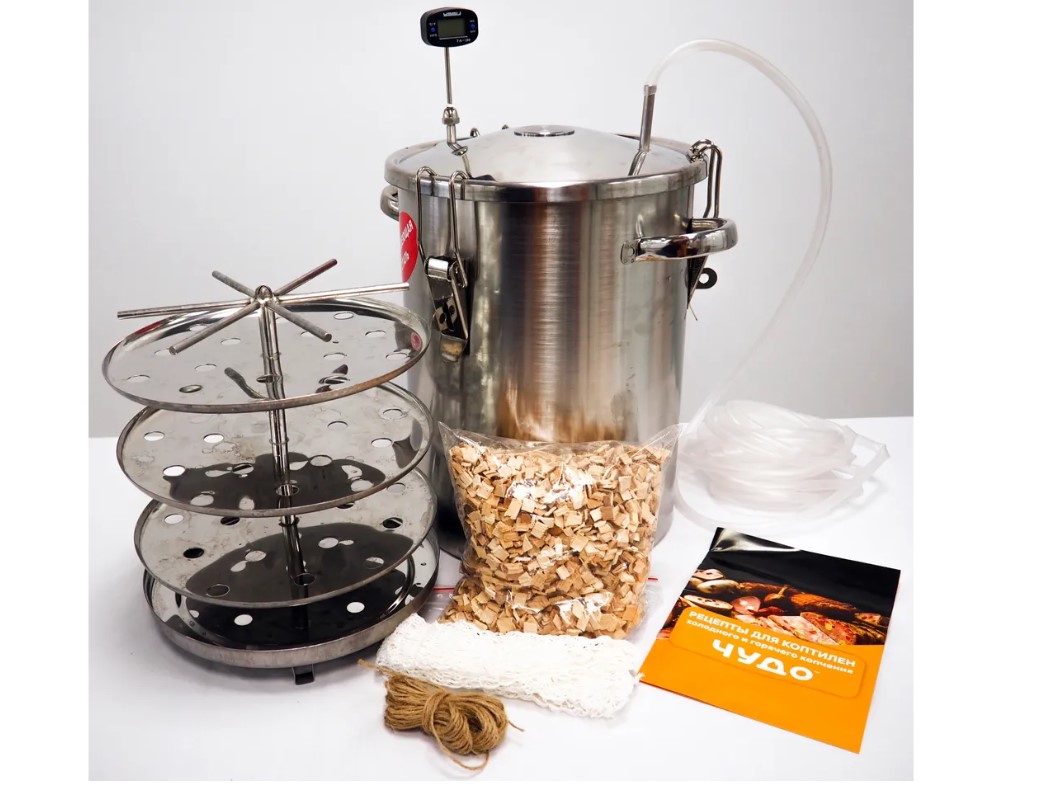 Емкость для копчения объемом 14 литров из пищевой нержавеющей стали - 1 шт, съемная крышка - 1 шт, шланг для выхода дыма - 6 м, термометр игольчатый электронный - 1 шт, коромысло для подвески продукта - 1 шт, поддон для жира - 1 шт, противень для укладки продукта - 3 шт, щепа буковая высокой степени просушки - 0,3 кг, сетка эластичная для копчения мясо-рыбопродуктов - 1 шт, шпагат джутовый 3 нити, полированный - 10 м, руководство по эксплуатации - 1 шт.