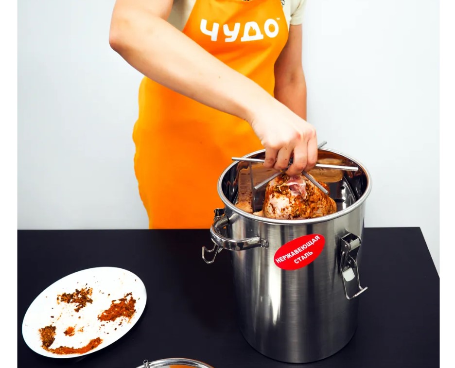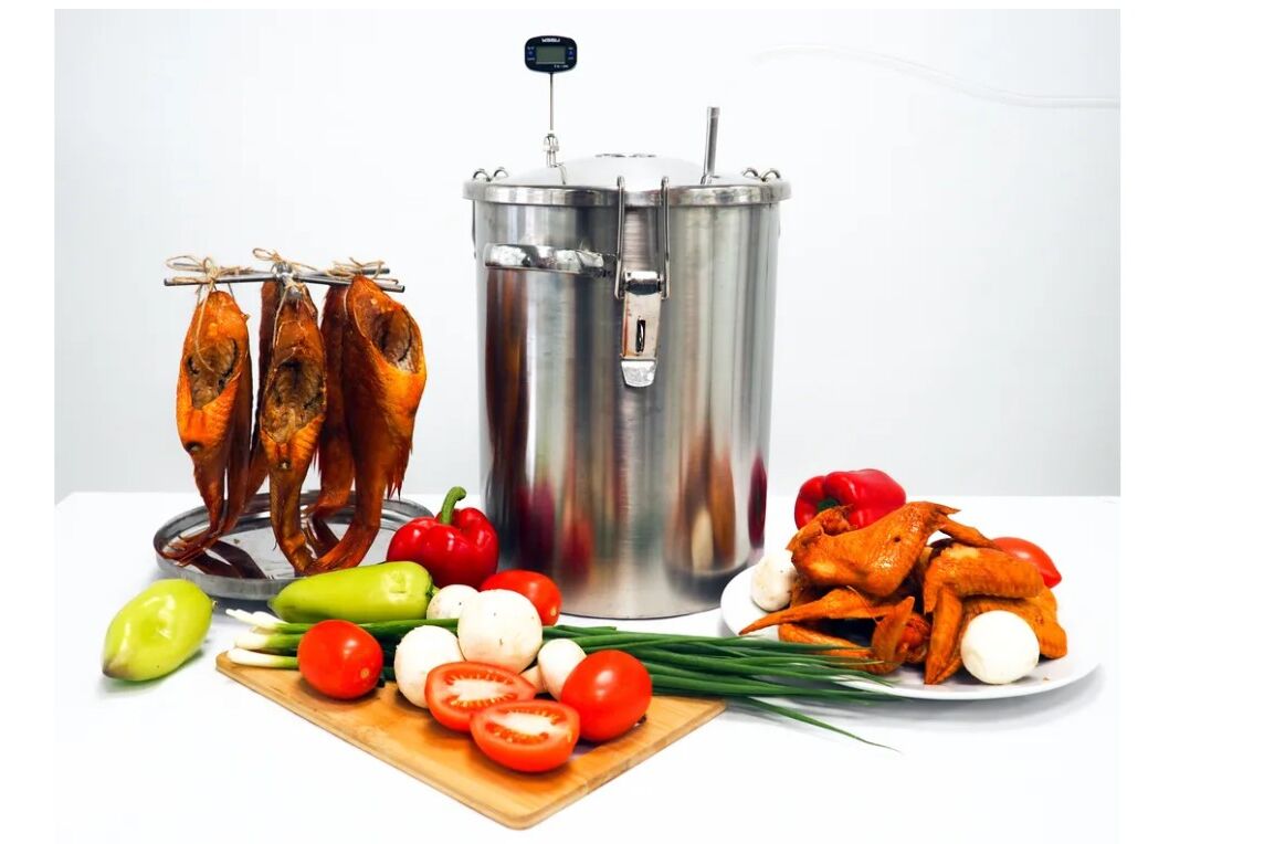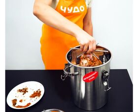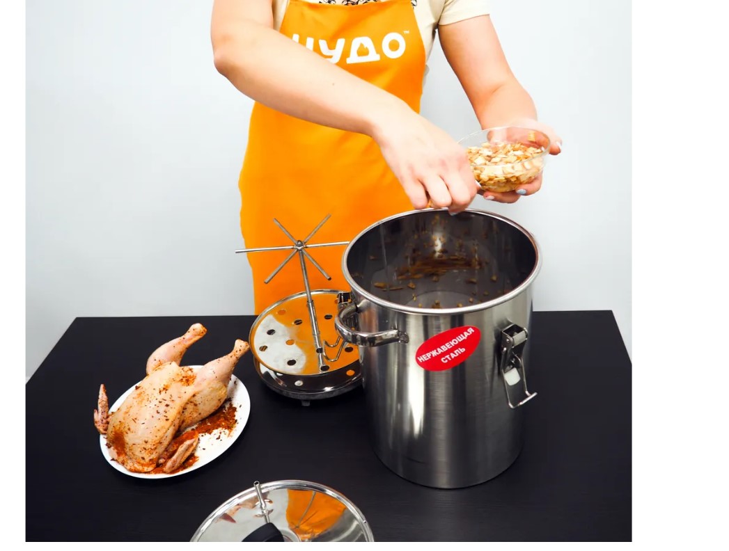 Вкус копченых продуктов нравится многим людям, но натуральность и состав магазинных копченостей остаются сомнительными, при этом цена на них зачастую довольно высокая. Так, покупные копченые продукты часто содержат канцерогены и Е-добавки – они усиливают вкус и продлевают срок годности продуктов, но точно не являются полезными. При этом продуктовые фабрики часто экономят на товаре и применяют переработанное сырье, а наценка на такие товары составляет от 200 до 300%. С домашней коптильней «Аромат КНГ-14» таких проблем не возникает, ведь вы сможете коптить собственные продукты, в качестве которых уверены и изготовление домашних лакомств обойдется по себестоимости. «Аромат КНГ-14» представляет собой коптильню горячего копчения, предназначенную для приготовления мяса, рыбы, курицы, овощей и многого другого на даче и даже в домашних условиях (в жилых помещениях, в квартире, в кухне). Конструкция полностью герметична – оснащена силиконовой прокладкой и длинным шлангом для отвода дыма, это позволяет избежать любого запаха! При этом в комплектации идет термометр для контроля температуры, шланг ПВХ для отвода дыма из помещения (длиною 6 метров), щепа буковая 300 грамм, сетка эластичная для копчения мясо/рыбопродуктов и шпагат джутовый, что позволяет готовить прямо из коробки. А наличие разборной кассеты-трансформера позволит как вертикально подвешивать продукты на коромысле, так и горизонтально размещать их на поддонах.