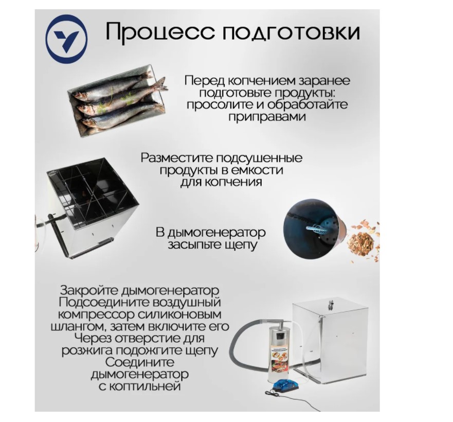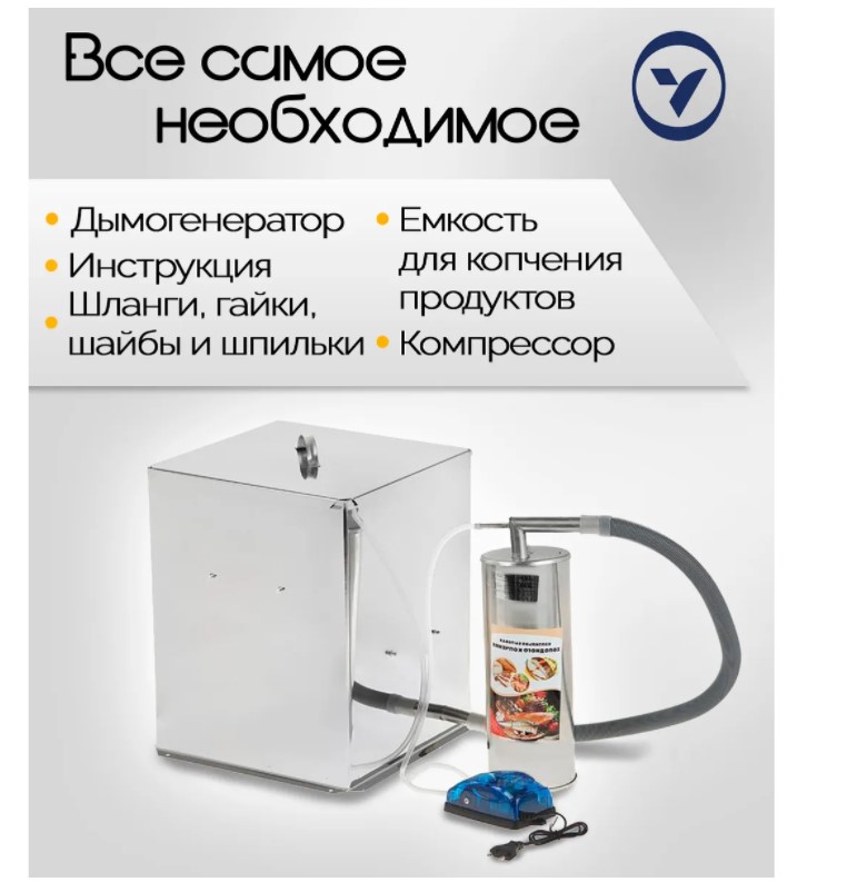 Помимо ёмкости для копчения в комплектацию входит дымогенератор для деревянной щепы, а также электрический компрессор. Холодным копчением называется обработка продуктов дымом с температурой от 19 до 40 градусов Цельсия.