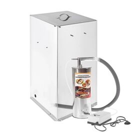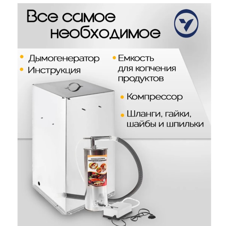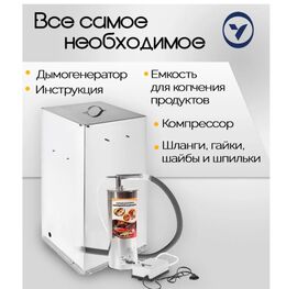 Помимо ёмкости для копчения в комплектацию входит дымогенератор для деревянной щепы, а также электрический компрессор. Холодным копчением называется обработка продуктов дымом с температурой от 19 до 40 градусов Цельсия.