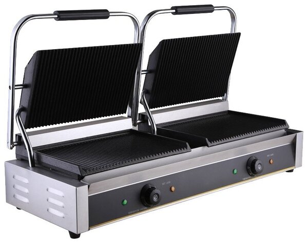 Оснащён двумя терморегуляторами, термоизолированными ручками на верхней панели и «плавающим» креплением, позволяющим подстроиться под толщину продукта. Ограничитель, расположенный на нижней панели прибора, срабатывает при температуре 130 °C.