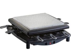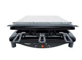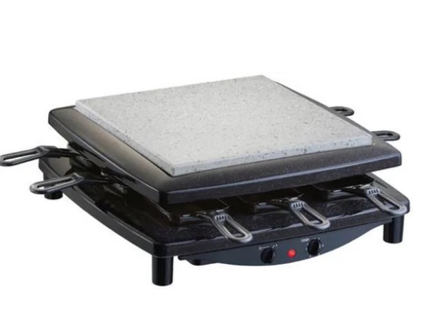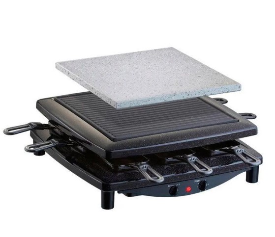 Раклетница Steba RC 3 обладает качественным верхним грилем, благодаря которому, вы сможете готовить вкусное мясо, рыбу или овощи. Он изготовлен из натурального камня, поэтому обладает множественными плюсами – он не царапается, к тому же его можно мыть в посудомоечной машине, что согласитесь, не совсем привычно. Любителям швейцарского блюда фондю, понравятся сковородочки, которые имеют небольшой размер и оборудованы ручками. Они не нагреваются при жарке, так что вы можете быть спокойны – при правильном и аккуратном использовании, ожоги рук исключены