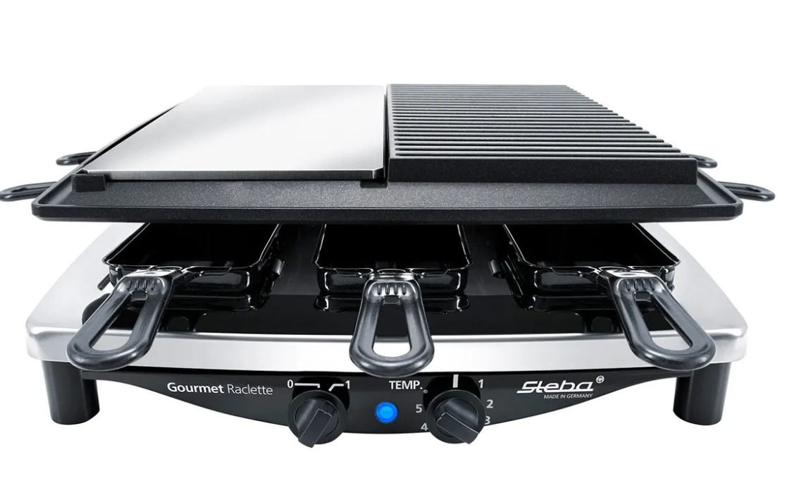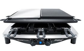 Гриль-раклетница Steba RC 8 Steel De Luxe предназначен для жарки мяса, рыбы и овощей с одновременным плавлением сыра в частных домах, квартирах, отелях и офисах. Модель оснащена панелью управления с поворотными регуляторами, светодиодным индикатором работы, двумя съемными пластинами для гриля и лотком для стока жира. Корпус выполнен из нержавеющей стали. В комплект поставки входят 8 порционных сковородок, литая пластина для гриля с антипригарным покрытием и двусторонняя пластина для гриля из нержавеющей стали. Панель с антипригарным покрытием (29 x 14,5 см). Двусторонняя панель из нержавеющей стали (29 x 14,5 см). Бесступенчатая регулировка нагрева. Кнопка включения / выключения. Легкая чистка. Световой индикатор. Место хранения шнура. В комплекте 8 эмалированных сковородок: — можно мыть в посудомоечной машине; — устойчивы к порезам и царапинам.