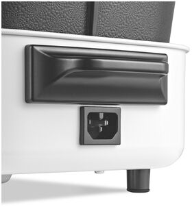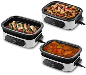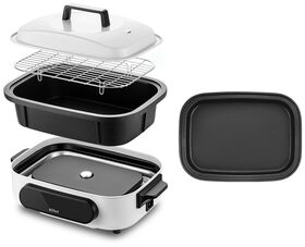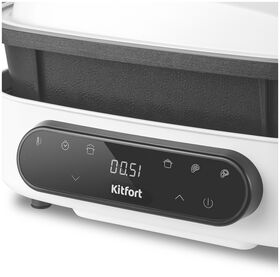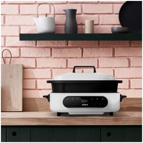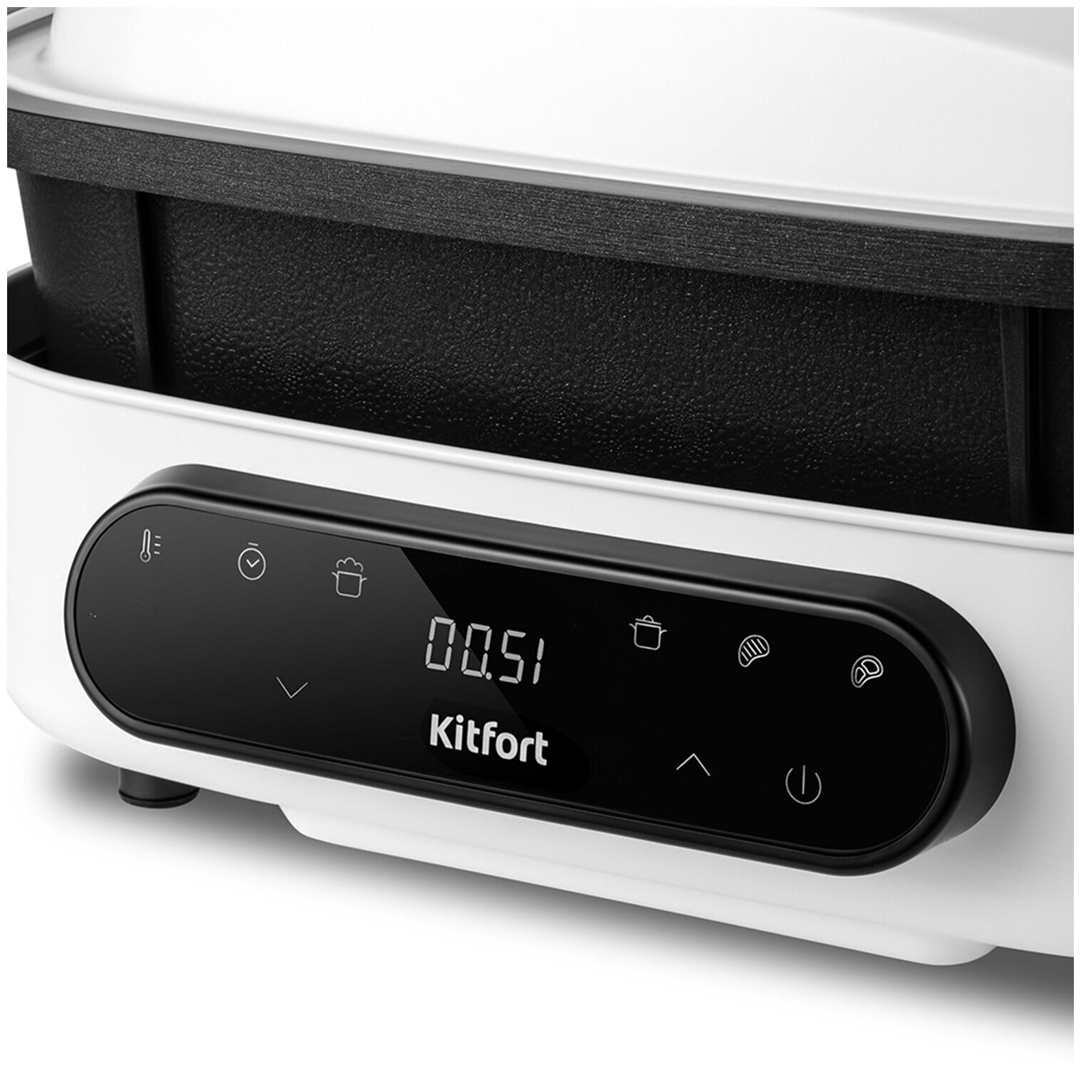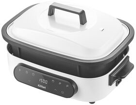 Электросковорода оснащена дисплеем и сенсорной панелью управления, с помощью которой можно выставить нужную программу приготовления, регулировать мощность и время. Мощность регулируется ступенчато в диапазоне от 300 Вт до 1200 Вт. Емкость сковороды - 1,6 л.Электропитание