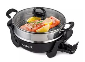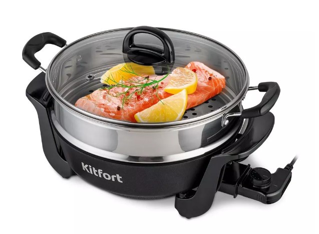 Комплектация Электросковорода с ручками для переноски — 1 шт., Крышка с ручкой — 1 шт; Чаша для приготовления на пару — 1 шт., Сетевой шнур с термостатом — 1 шт; Руководство по эксплуатации — 1 шт