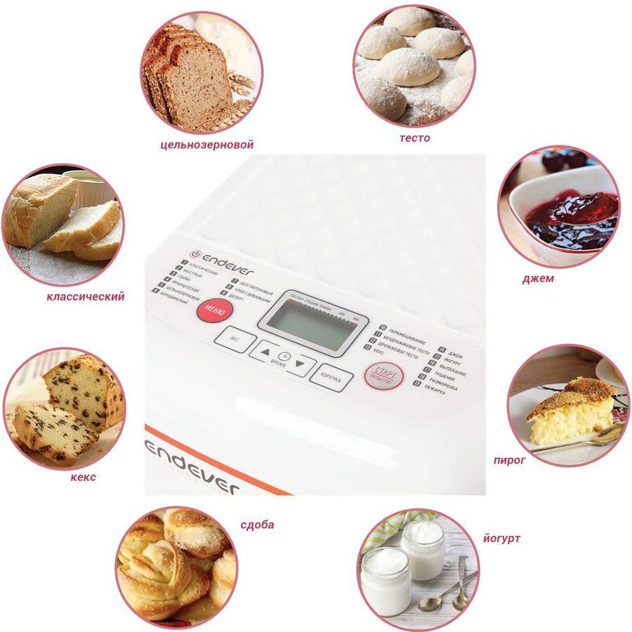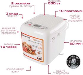Функции | выбор размера хлеба / 450 – 600 г / выбор степени запекания таймер отсрочки старта / 15 часов / поддержание температуры / 60 минут / режим быстрой выпечки |