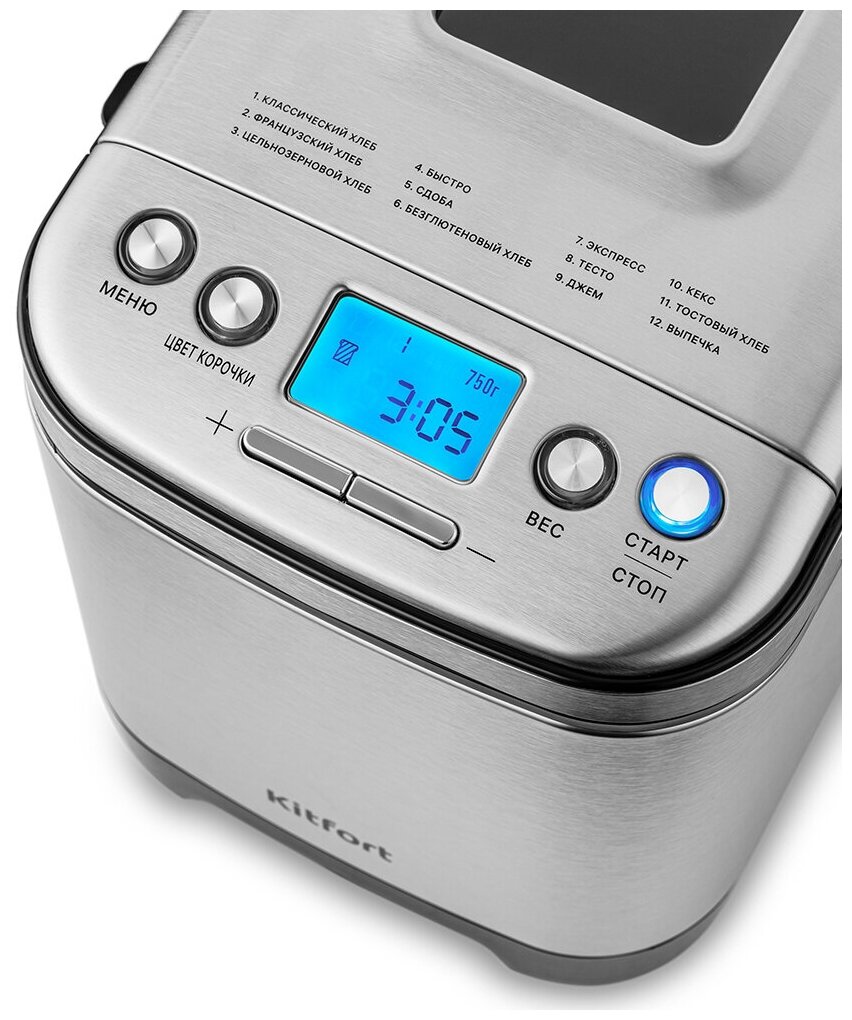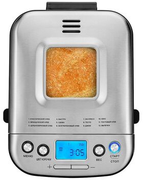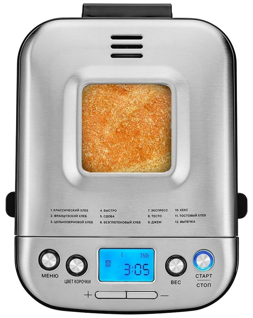 Программы: варенье, кекс, Тесто, Безглютеновый хлеб, Быстро, Тостовый хлеб, Французский хлеб, Сдоба, Цельнозерновой хлеб, Экспресс, Классический хлеб, Выпечка