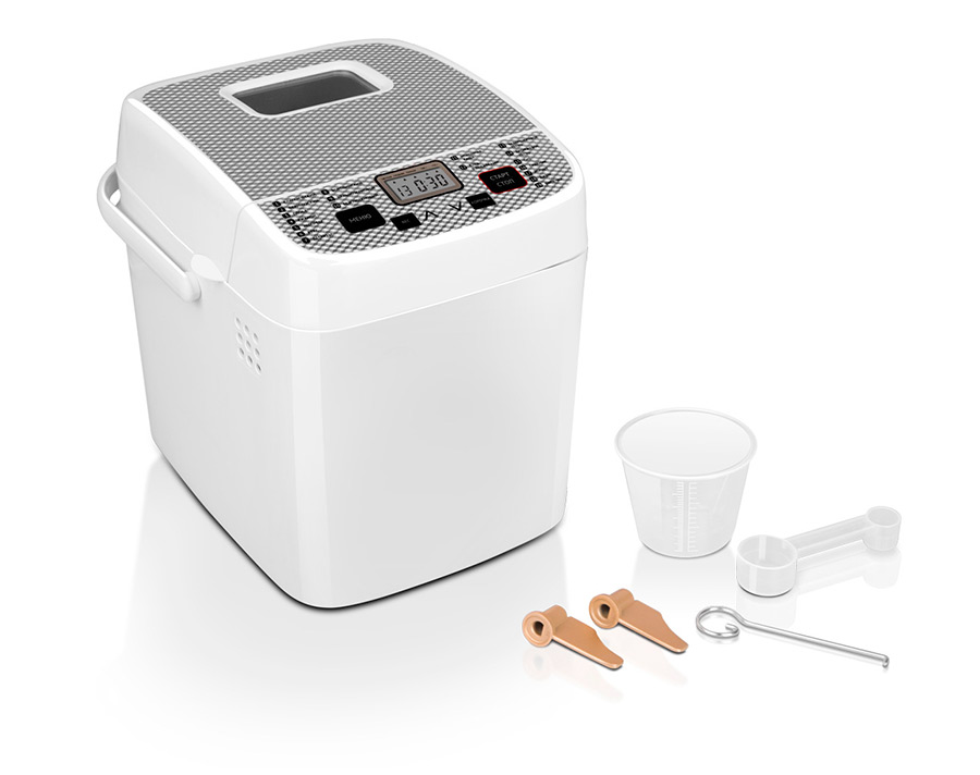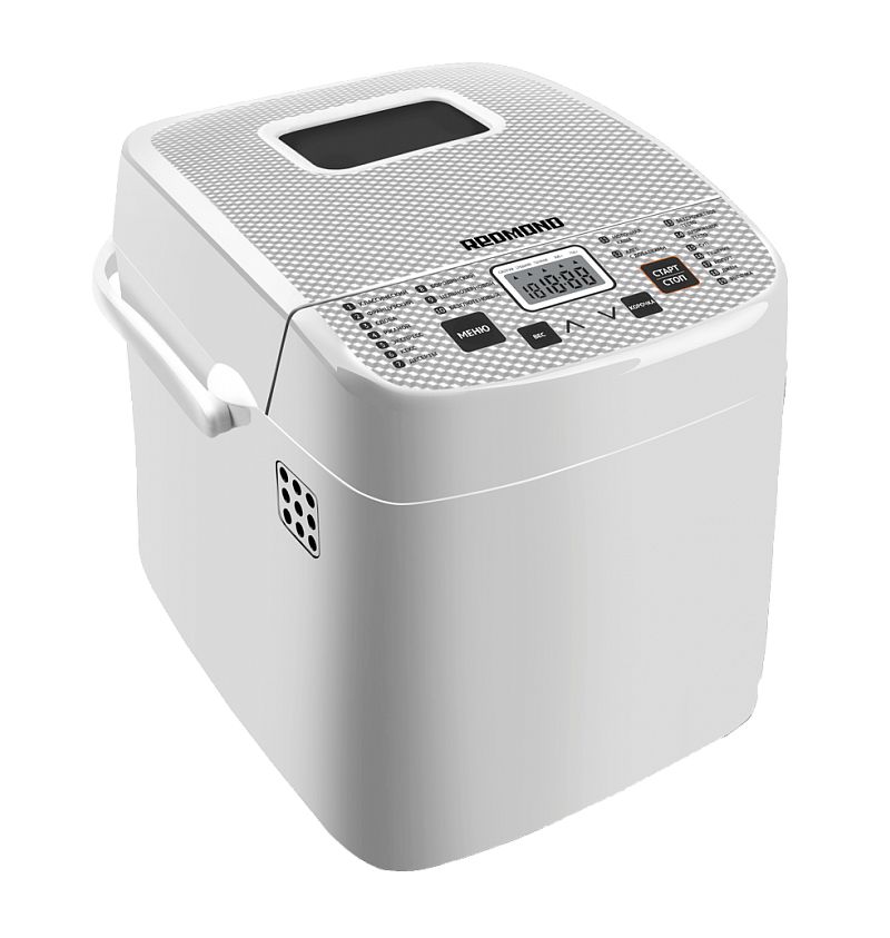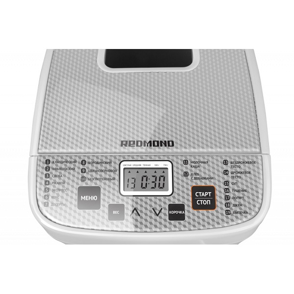 Программы выпечки: классический хлеб, французкий хлеб, ржаной хлеб, сдоба, экспресс, десерты, кекс, бородинский хлеб, цельнозерновой хлеб, безглютеновый хлеб, молочная каша, хлеб с добавками, бездрожжевое тесто, дрожжевое тесто, суп, тушение, йогурт, джем, выпечка