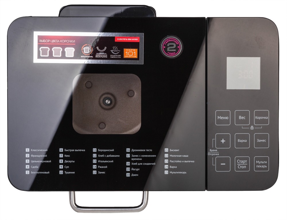 Хлебопечь M1909 имеет 24 автоматические программы, позволяющие готовить даже основные блюда, гарниры, супы, каши, йогурты и особый диетический хлеб (цельнозерновой и безглютеновый). Более того, инновационный прибор возьмёт на себя замешивание и расстойку дрожжевого и пресного теста.