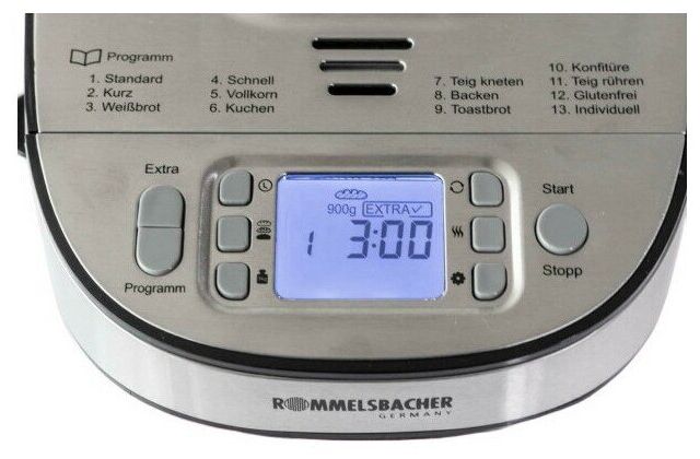 в комплекте: мерный стакан, мерная ложка, крючок для снятия тестомеса; программы: программы выпечки хлеба в т.ч. безглютенового хлеба, для замешивания тяжелого, дрожжевого, жидкого теста, для сладкой выпечки, приготовления джема, программа индивидуальных настроек выпечки хлеба