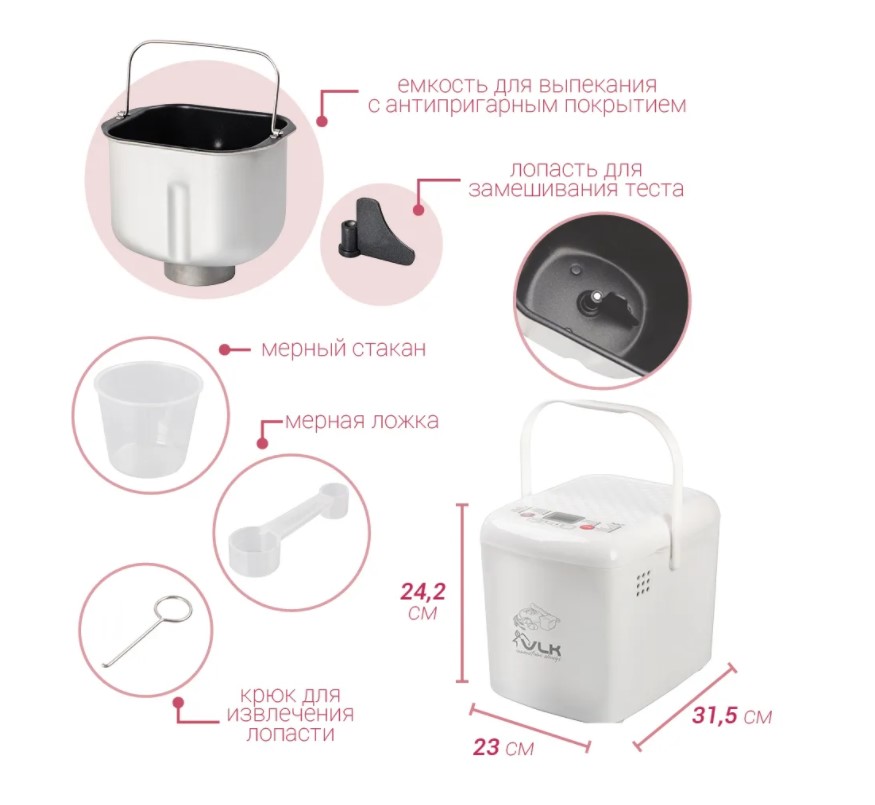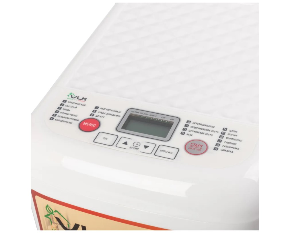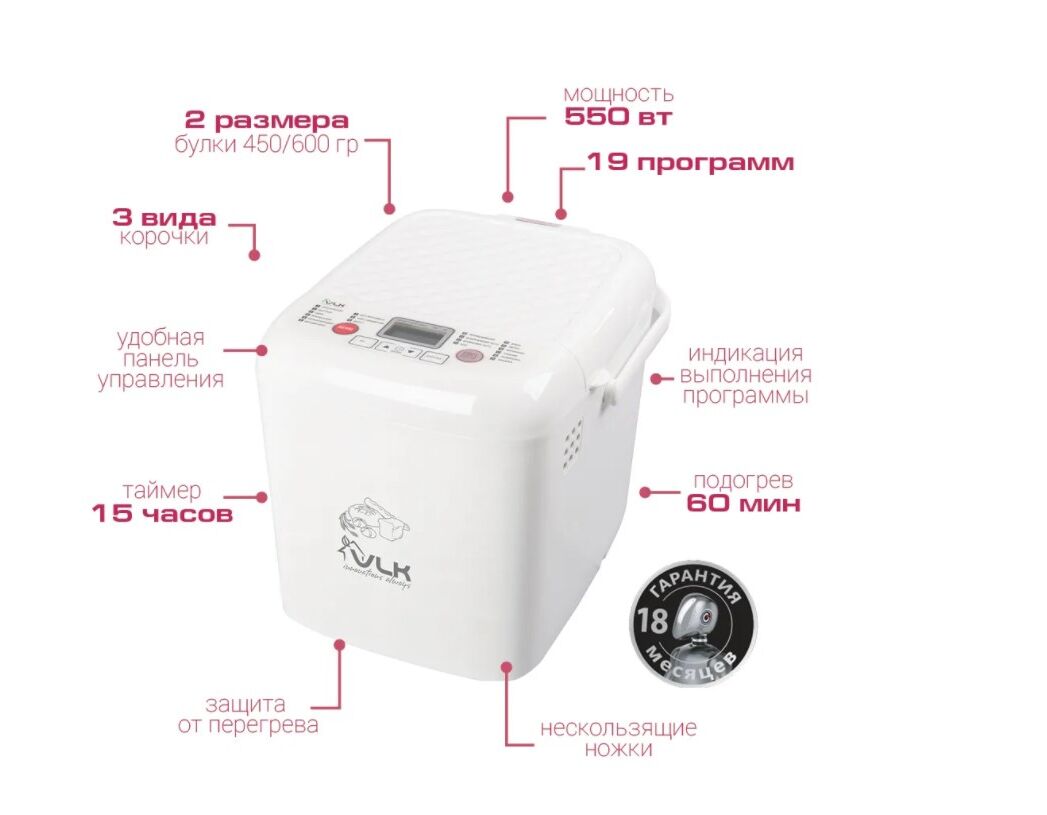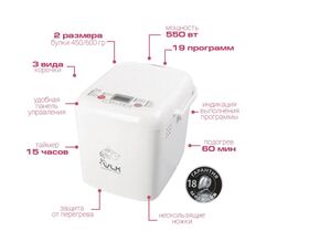 Функции | выбор размера хлеба / 450, 600 г / выбор степени запекания / светлая, средняя, темная / таймер отсрочки старта / 15 часов / поддержание температуры / 60 минут / режим быстрой выпечки |