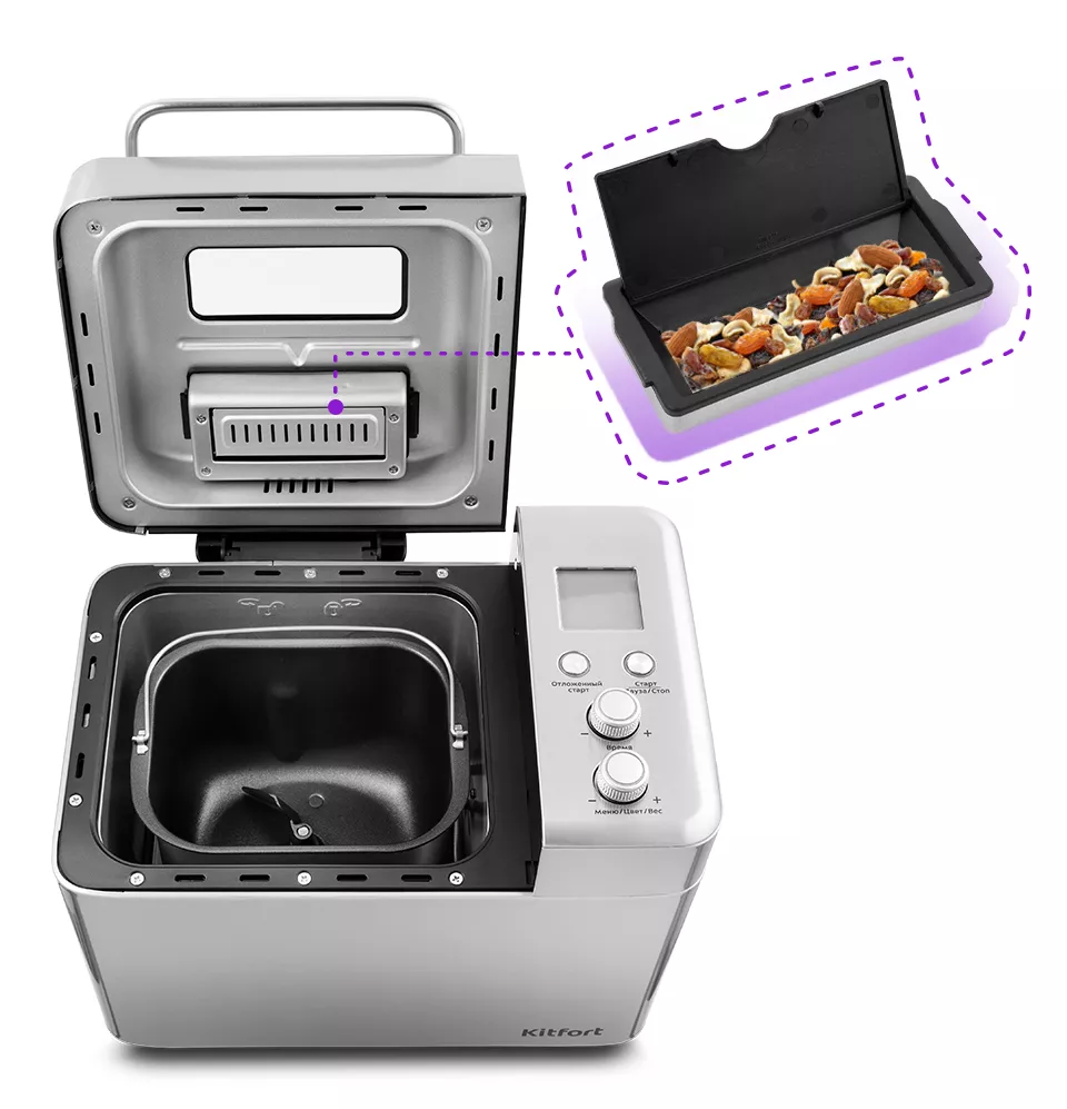 В крышку установлен автоматический дозатор для добавления в выпечку дополнительных ингредиентов во время приготовления без вашего участия! Кунжут, орехи, зелень, изюм, цукаты – всё и даже больше на ваш вкус