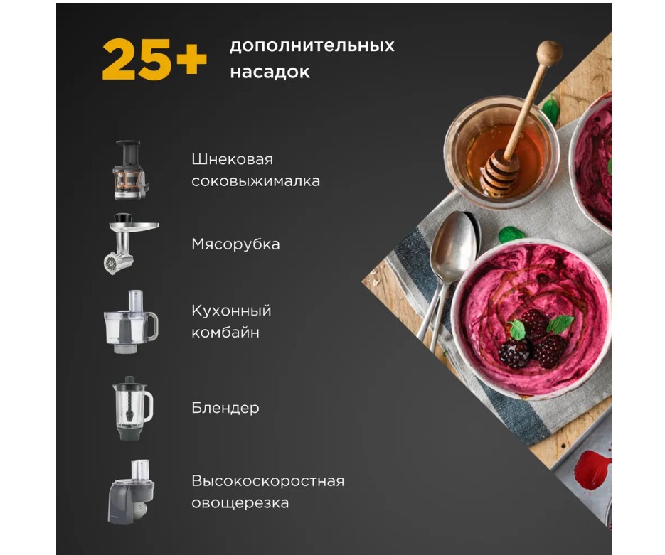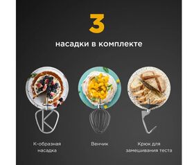 Модель имеет стандартную комплектацию из 3 насадок. Венчик – для взбивания например воздушной меренги, К-образная насадка – для идеального перемешивания ингредиентов и крюк-для замешивания теста. В комплекте также предусмотрена большая 5-литровая чаша, сделанная из качественной нержавеющей стали.
