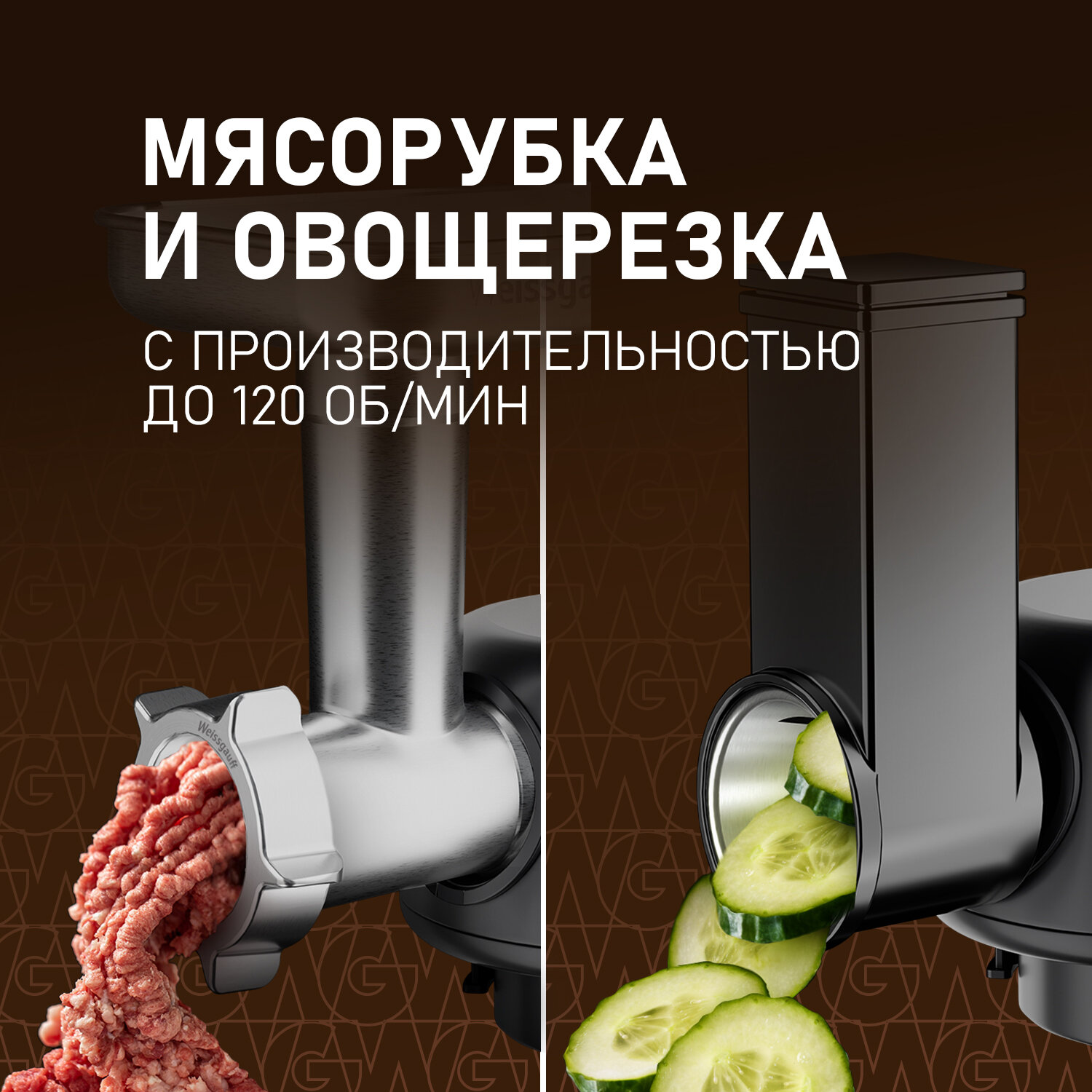 Насадки в комплектации: Венчик для взбивания, Насадка для смешивания, Крюк для теста, Насадка овощерезки (3шт), Перфорированные диски мясорубки (3 шт)