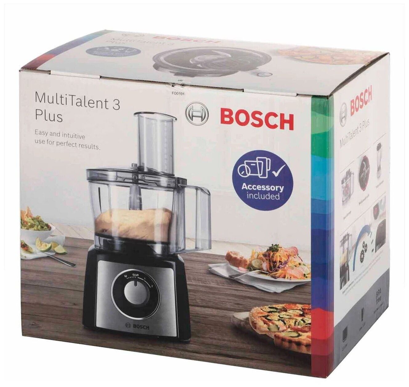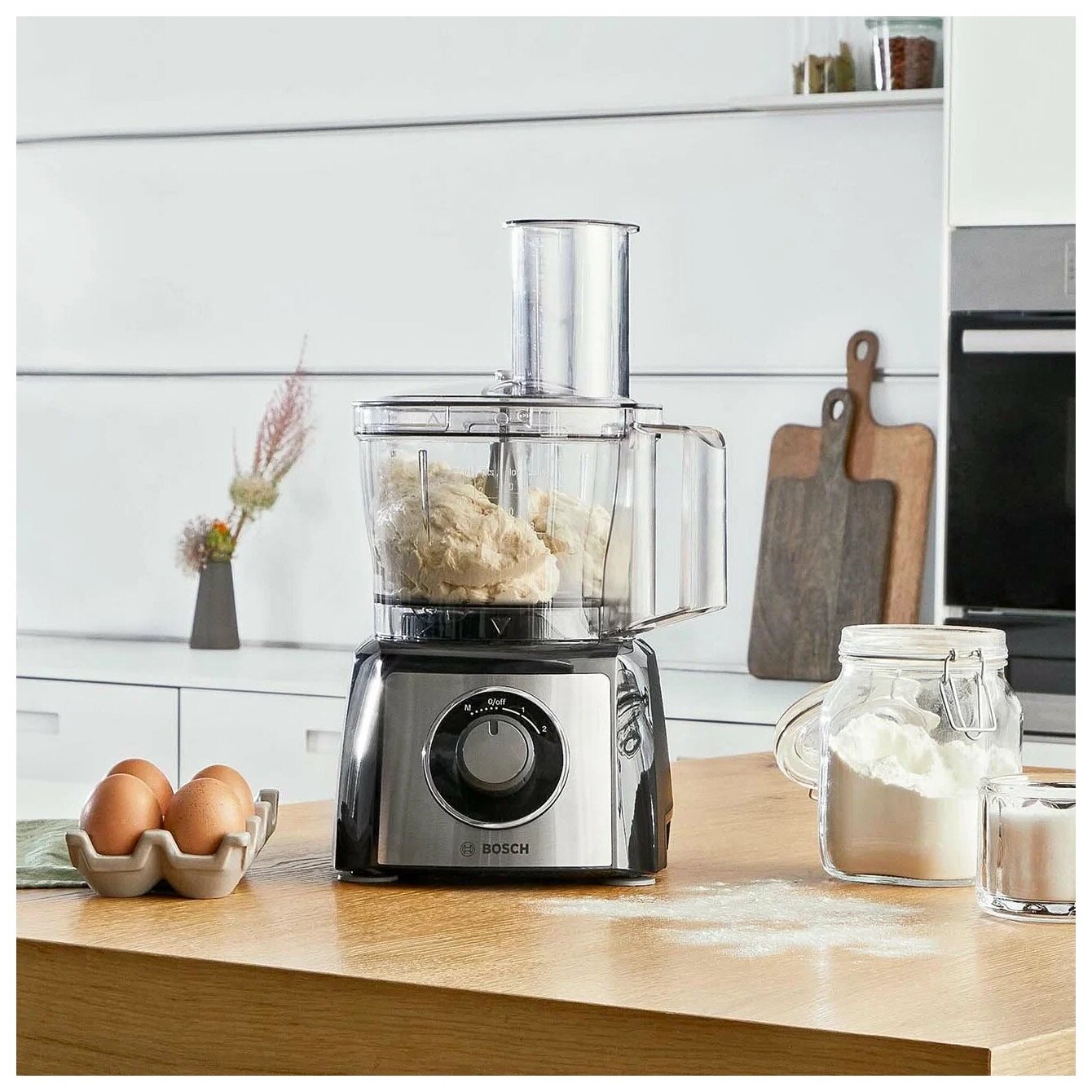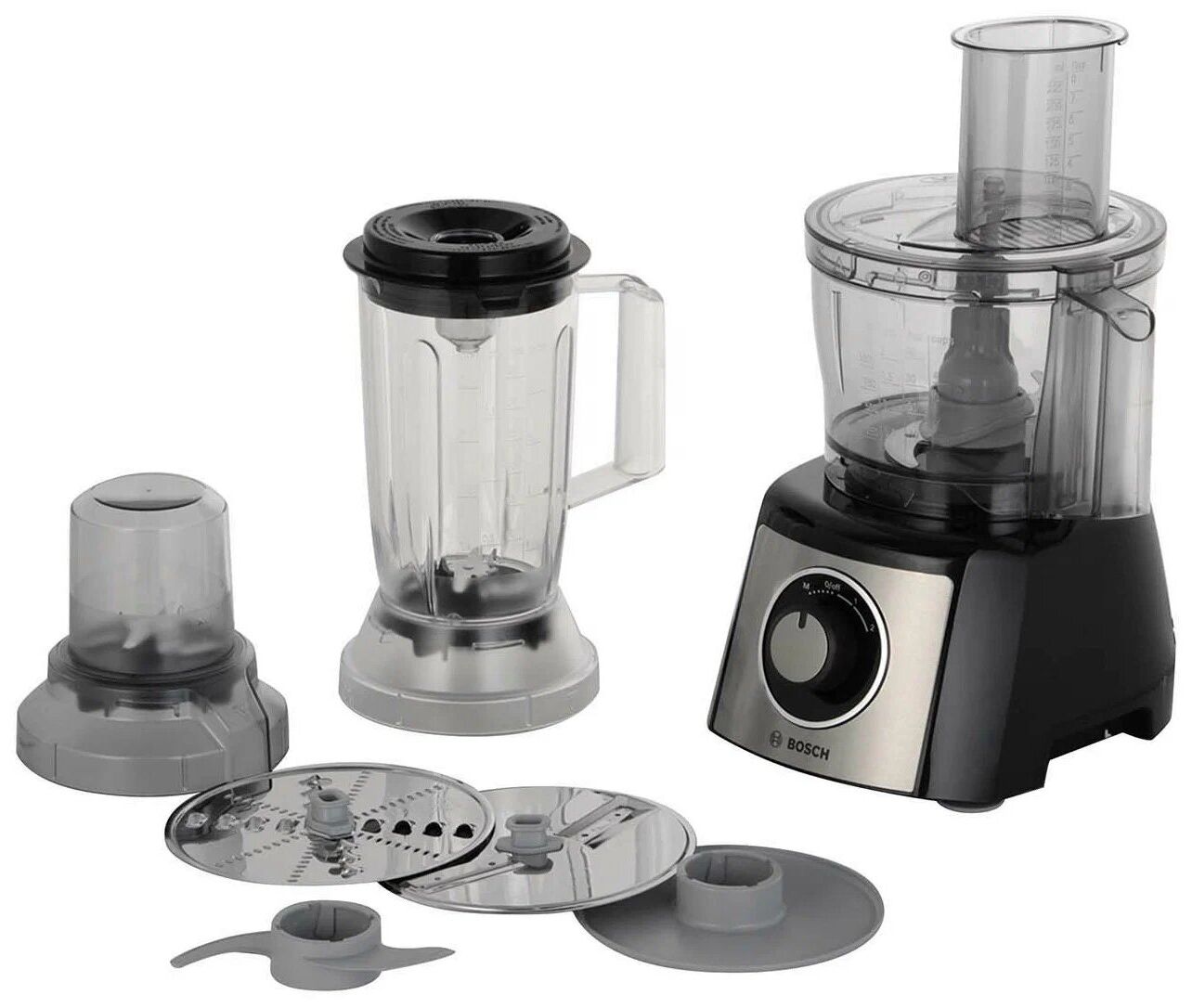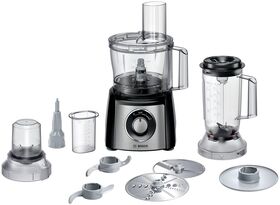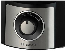 Кухонный комбайн Bosch MCM3PM386 — многофункциональное устройство с набором сменных насадок: пластиковая чаша объемом 2,3 л, блендер объемом 1 л, два ножа для шинковки и терки, насадка из пластика для замеса теста, диск для приготовления крема и нож для измельчения зелени. Машина позволяет замешивать тесто весом до 800 г. Мощность аппарата — 900 Вт. Есть два скоростных режима и один дополнительный импульсный.