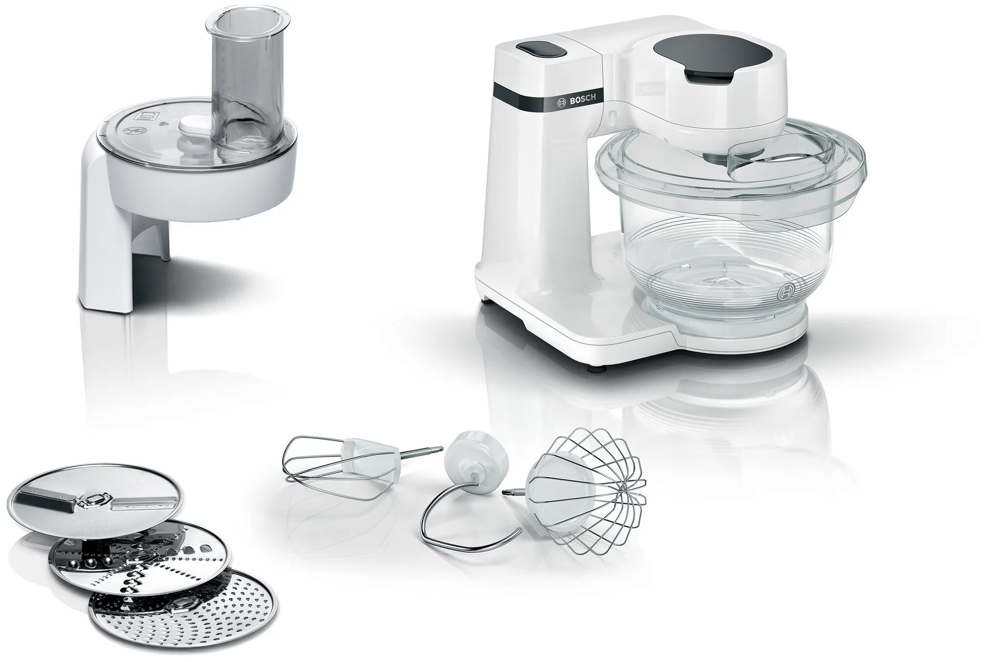 Bosch MUMS2TW01 – кухонная машина, которая облегчит и ускорит множество кулинарных задач. Модель поставляется с двумя венчиками для взбивания кремов и бисквита, крюком для замешивания теста и тремя разными тёрками для шинковки овощей и измельчения сыра и орехов.