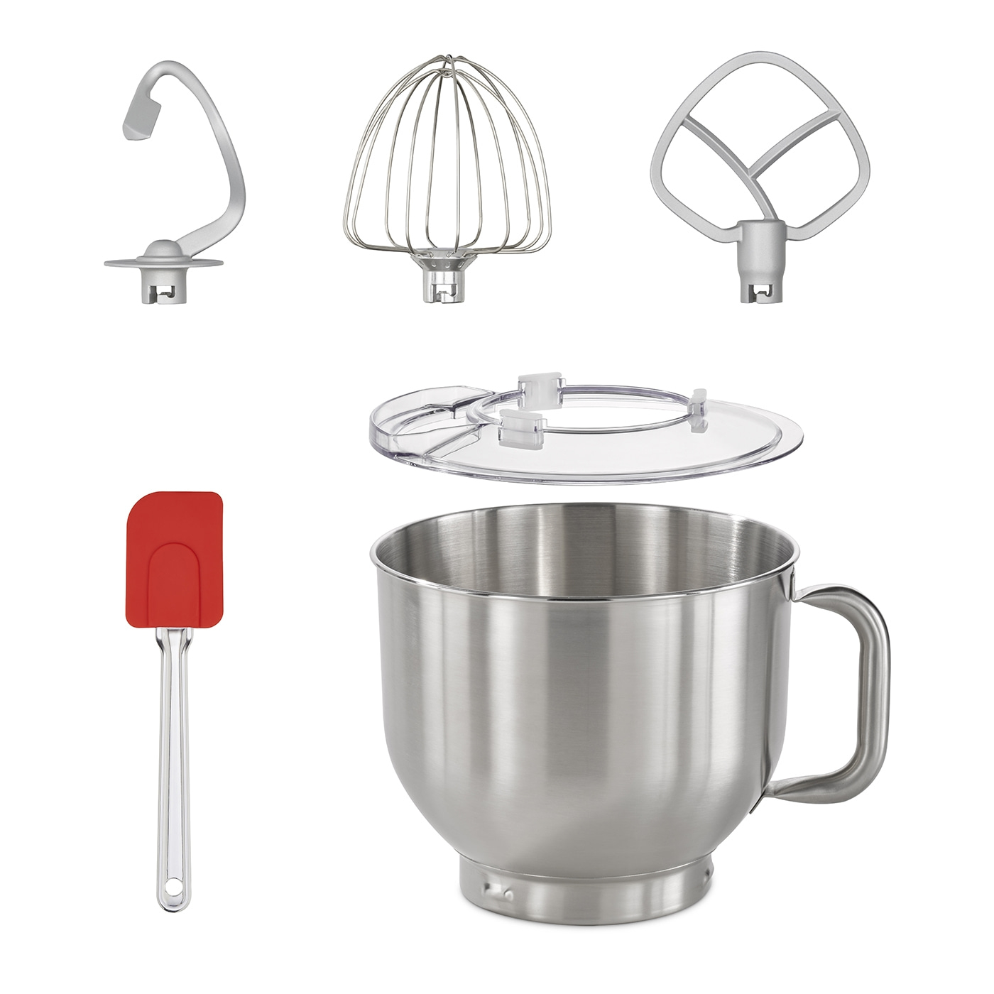 В комплект поставки входят крюк для тяжелого теста с антипригарным покрытием, насадка для лёгкого теста и перемешивания, венчик для взбивания, лопаточка для теста из силикона.