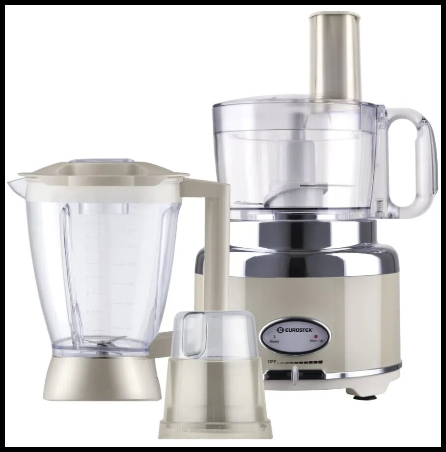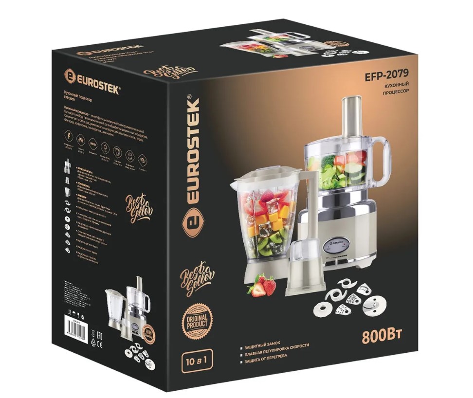 Кухонный комбайн "Eurostek" EFP-2079. Максимальная мощность 800Вт; металлический корпус, плавная регулировка скорости; измельчитель 1.2л., блендер 1.75л., кофемолка. Стальные лезвия измельчителя; диски для размягчения, получения эмульсий. Нарезка тонкими ломтиками, шинковка, приготовление жульена, картофельная терка - с 4-мя вставками.