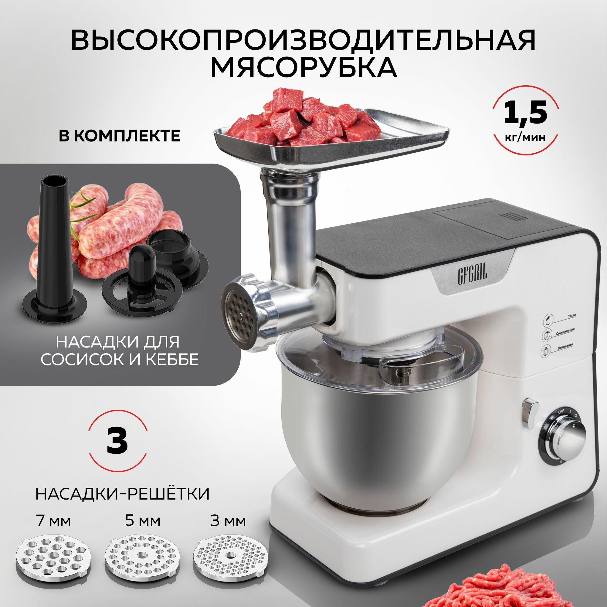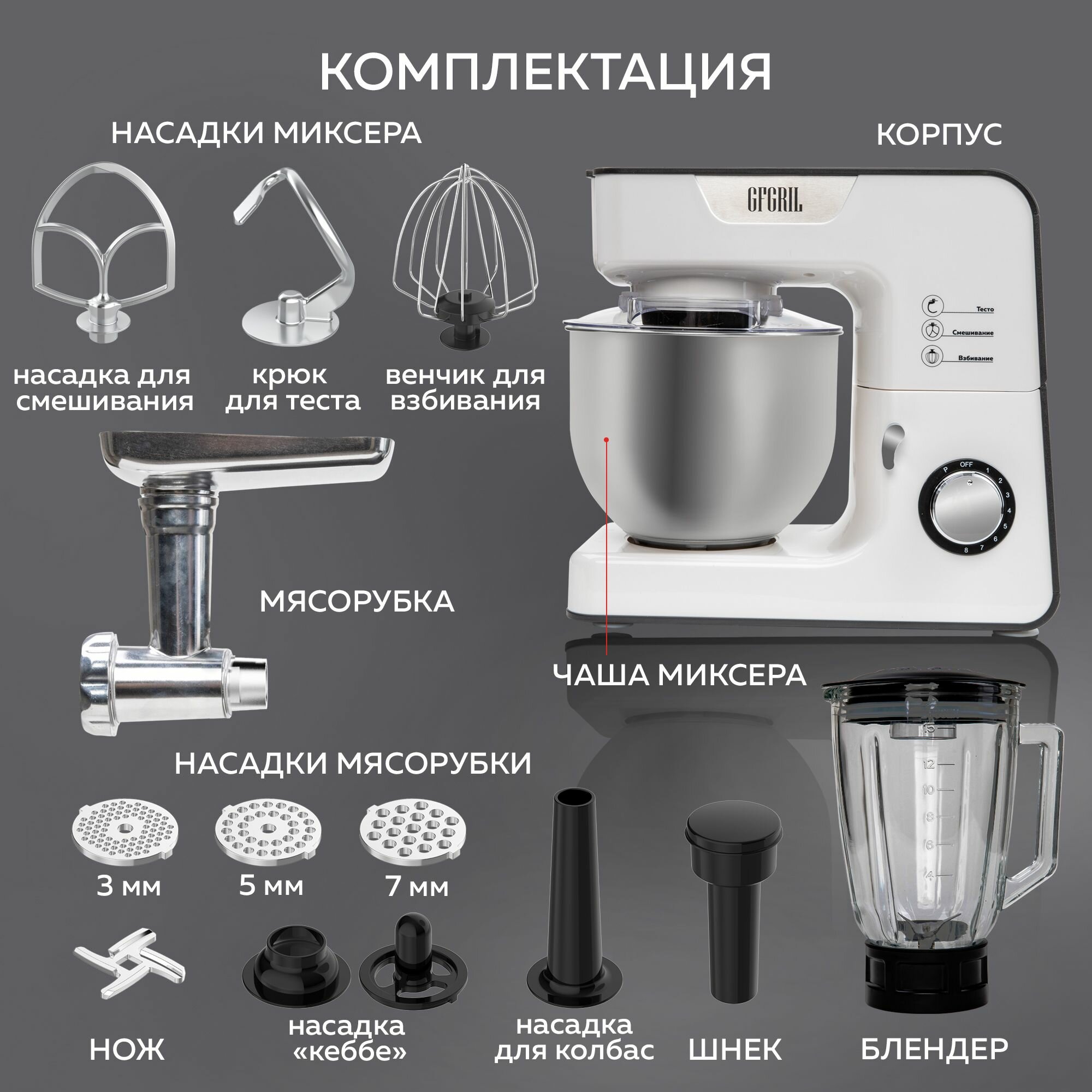 Венчик для взбивания, крюк для замешивания теста, насадка для смешивания, решетки для фарша (3, 5, 7 мм), насадка для сосисок, насадки для кеббе
