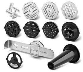 Мясорубка с металлическим приводом, 3 дисками (для мелкой, средней и крупной рубки), 6 насадками (для трубчатых макарон, лапши, спагетти, домашней колбасы, кеббе и 4 видов печенья)