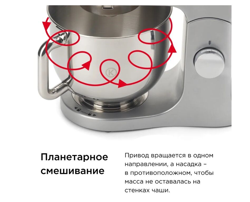 С большой чашей из нержавеющей стали и мощным мотором, функцией планетарного смешивания и линейкой дополнительных насадок, кухонная машина Kenwood справляется с большими количествами ингредиентов и самым твёрдым тестом. Уникальная функция деликатного смешивания ингредиентов позволяет насадкам в чаше делать очень медленные обороты (2.5), чтобы качественно перемешать ингредиенты без потери воздушной структуры, что является важным для смесей для выпечки. Электронный контроль скорости обеспечит Вам удобство и непревзойденно качественное смешивание. Для дополнительной безопасности кухонная машина оснащена функцией автоматической остановки, если крышка поднимается или открыта. Плавный старт, 6 скоростей, быстрая остановка. Низкоскоростное гнездо для крепления спереди позволяет использовать до 9 насадок разного назначения. Корпус выполнен из литого алюминия; внутренние части - из закалённой стали; чаша из полированной нержавеющей стали объёмом 5 л вмещает мягкое тесто до 2,7 кг, до 12 яичных белков.