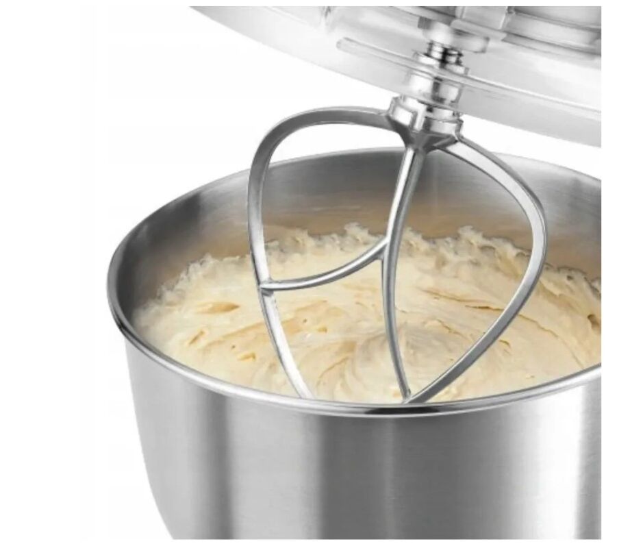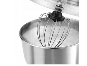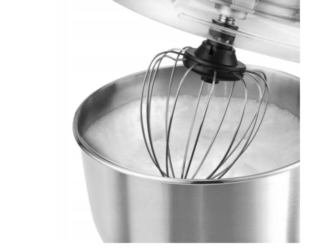 Он имеет три сильных наконечника , которые подходят для любого типа теста. Крюк используется для замеса густого теста , такого как тесто для хлеба, дрожжевое тесто, макароны или пельмени. Насадка для замешивания - в форме листа , используется для замеса теста средней густоты, такого как, например, тесто для блинов, бисквита, кремов. Венчики из нержавеющей стали используются для взбивания пены или взбитых сливок . Крюк и мешалка изготовлены из литого под давлением алюминия , что увеличивает их долговечность. Чаша емкостью 6,7 литров. Он изготовлен из нержавеющей стали, что делает его на 100% безопасным для здоровья, прочным и простым в уходе.. Чаша имеет прозрачную крышку. Содержимое чаши не разбрызгивается по всей кухне, и вы можете контролировать смесь во время работы , и даже высыпать ингредиенты для теста через специальное отверстие.