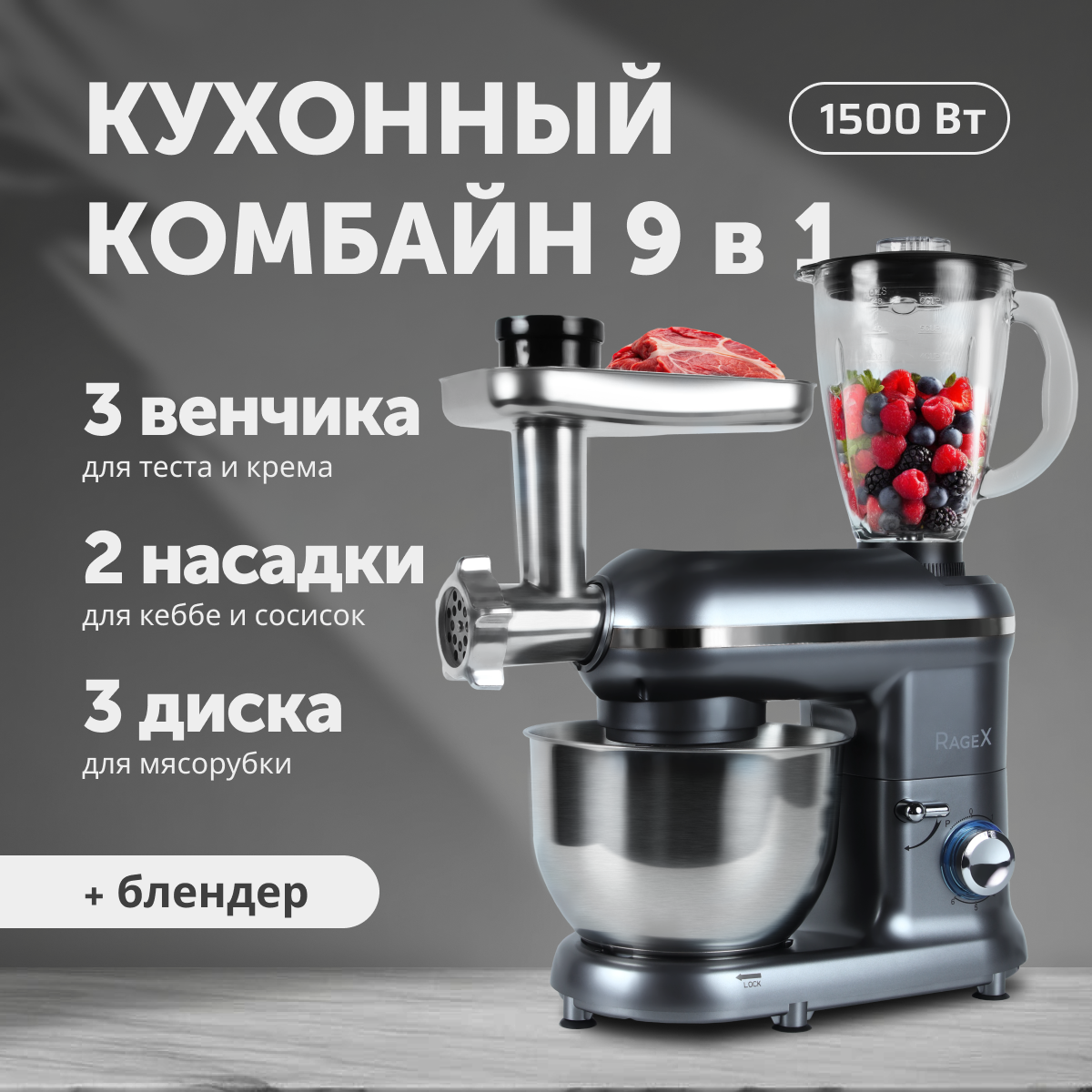 Комбайн кухонный, насадки (крюк для теста, плоский битер, венчик для взбивания), чаша металлическая, чаша блендера, мясорубка с 3 решетками и 1 ножом, металлический лоток для мясорубки, инструкция по использованию кухонного комбайна с мясорубкой, плотная упаковка для комбайна.