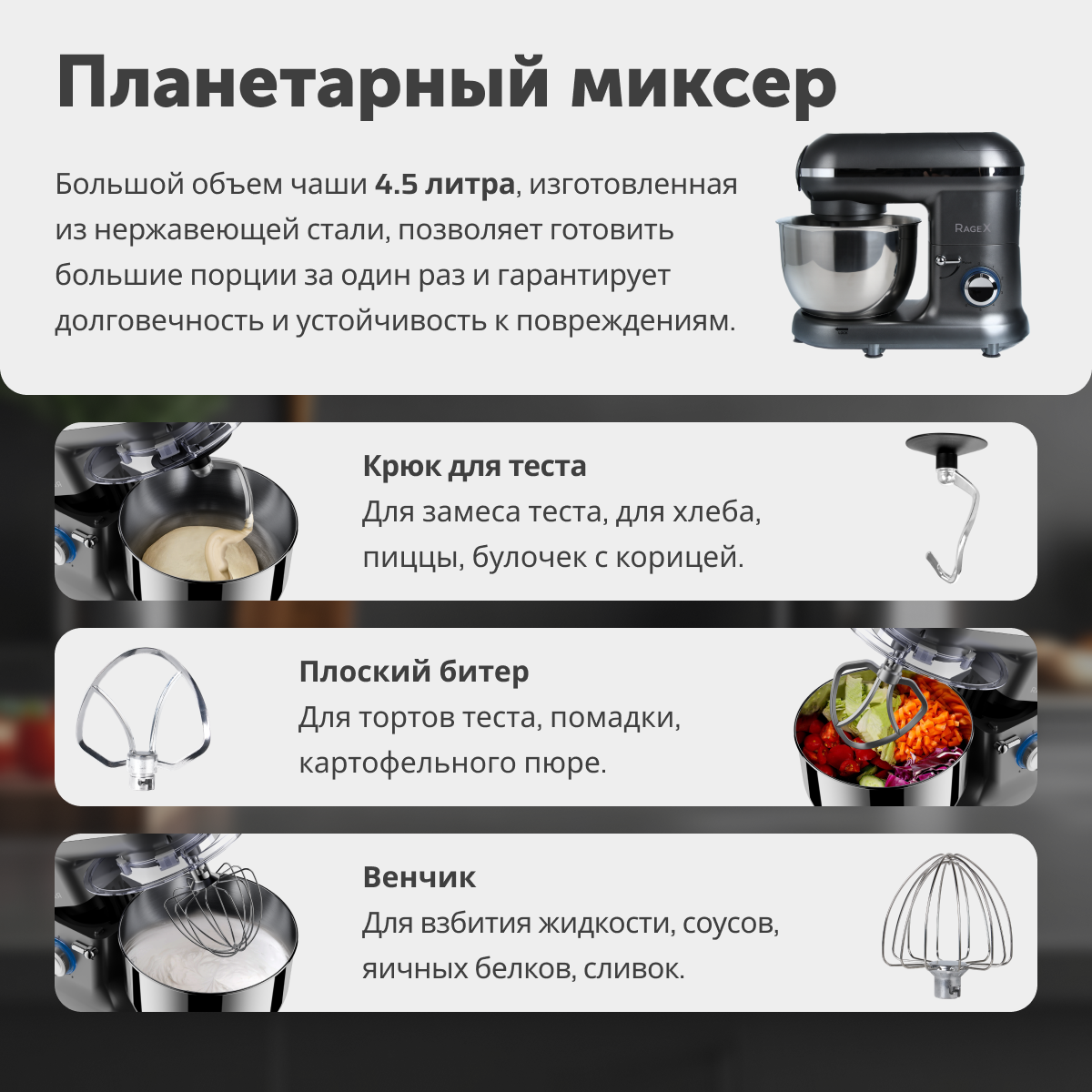 венчик для взбивания; крюк для теста; насадка для перемешивания