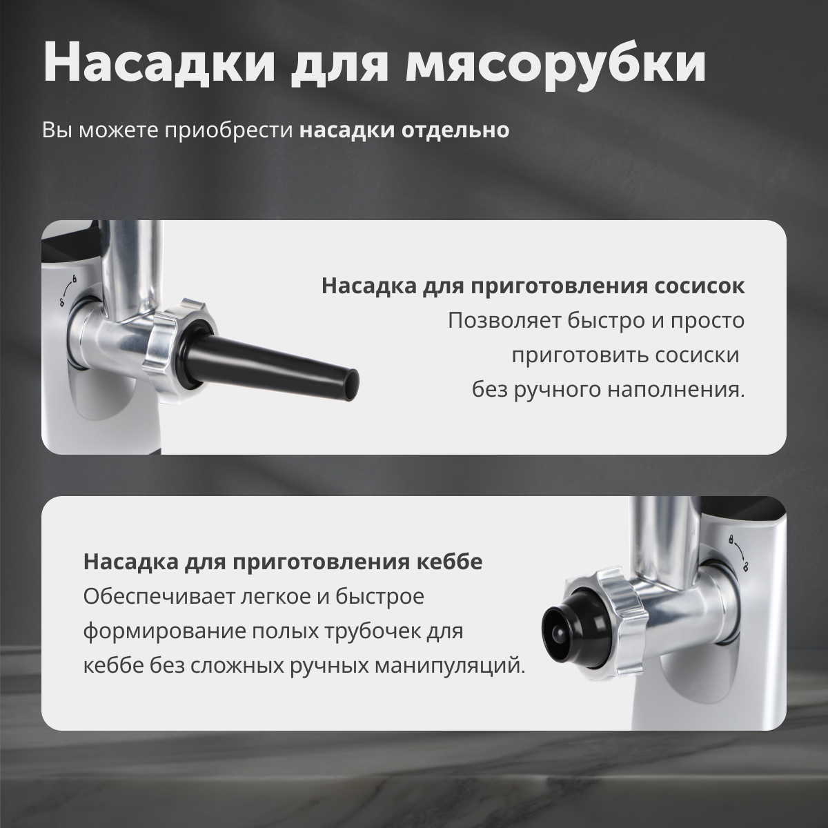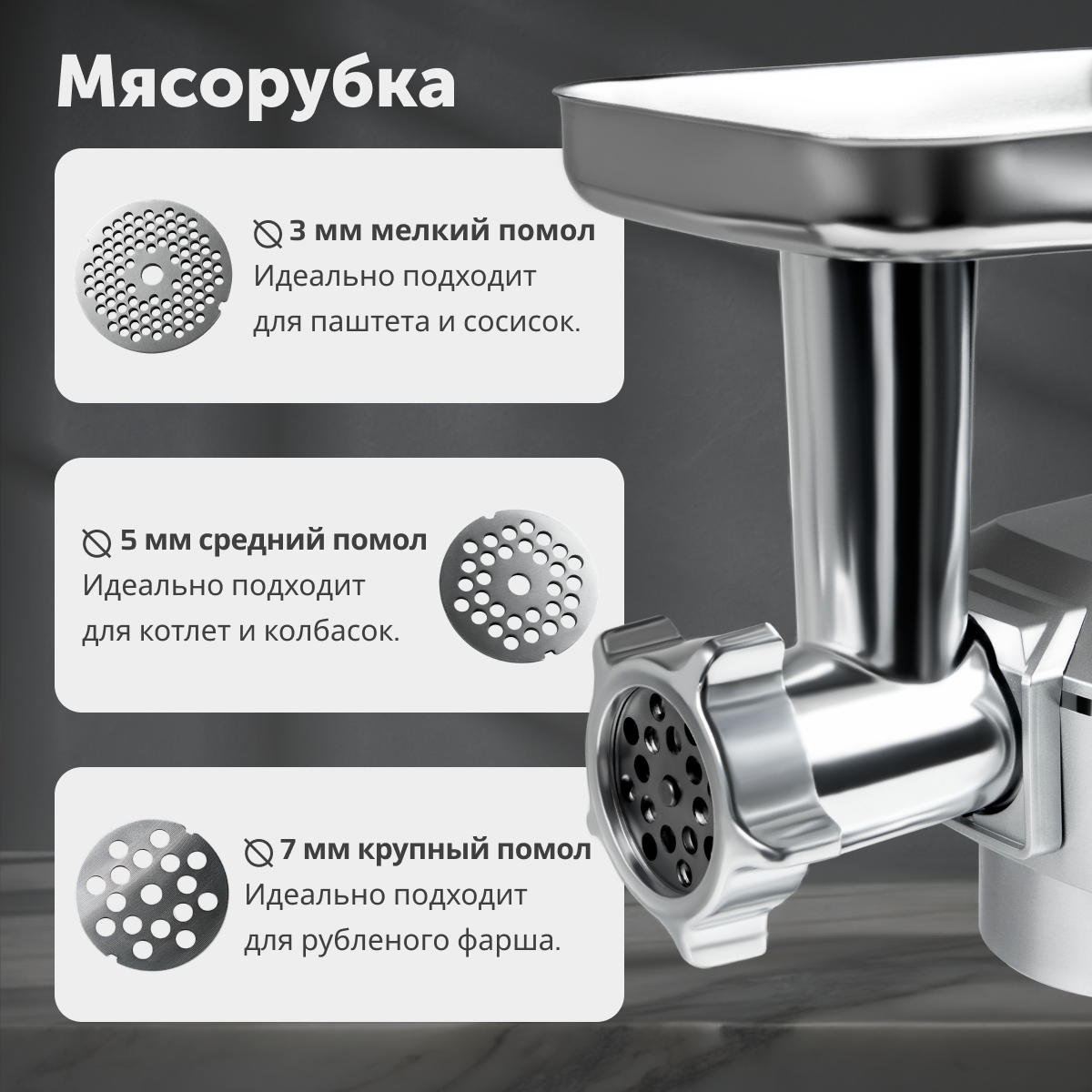 Мясорубка. Благодаря ей, вы легко перекрутите любой вид мяса в фарш. Используя дополнительные насадки можно приготовить колбаски, кеббе и даже фигурное печенье.