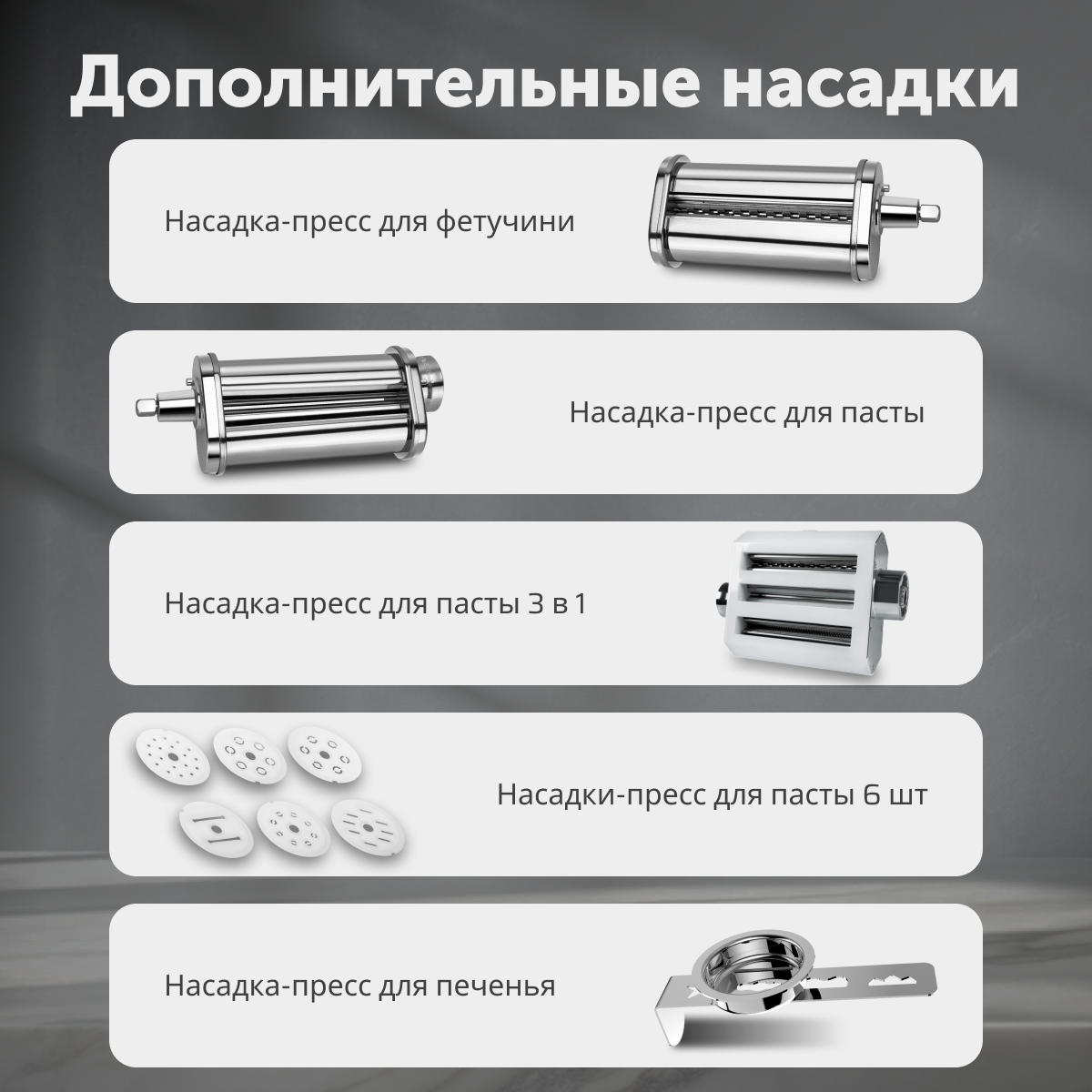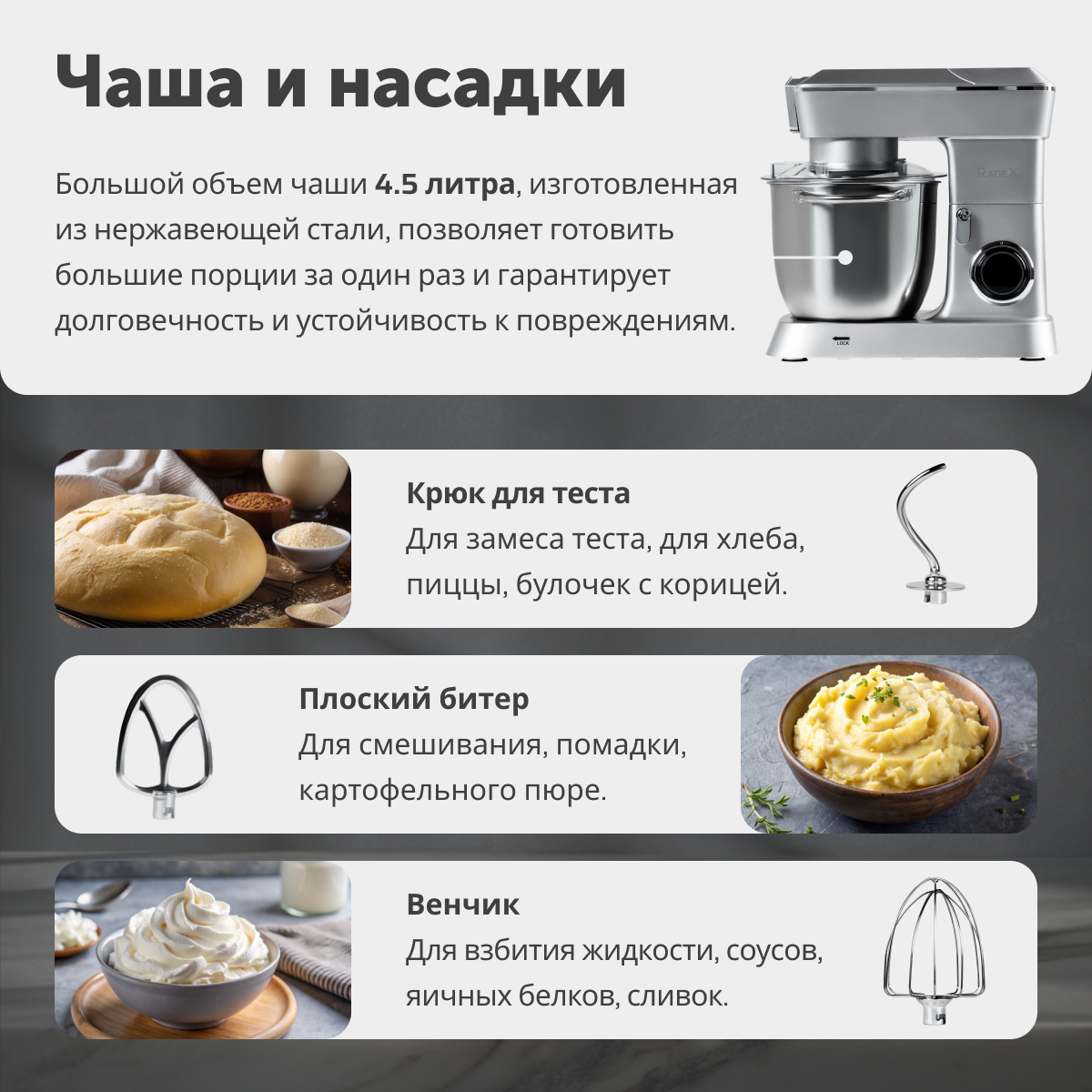 Планетарный миксер. Без труда замешивает любое тесто. Объем чаши на 4.5 л позволит смешать сразу большое количество продуктов. Отлично подойдет как для большой семьи, так и для кондитеров, делающих десерты на заказ. Корпус чаши изготовлен из нержавеющей стали, не впитывает запахи и жиры. При правильной эксплуатации прослужит вам долгие годы.