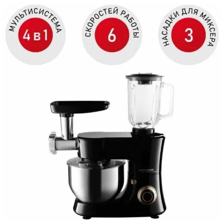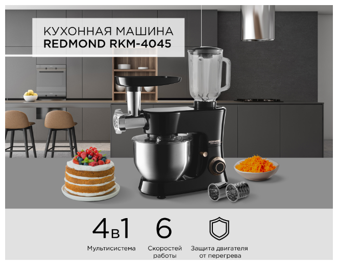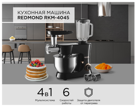 Кухонная машина REDMOND RKM-4045 – это ультрасовременная мультисистема «4 в 1», которая сочетает в себе возможности четырех разных устройств для подготовки ингредиентов и приготовления блюд и напитков. Установив нужные комплектующие, вы сможете использовать RKM-4045 как планетарный миксер, овощерезку, стационарный блендер и мясорубку.