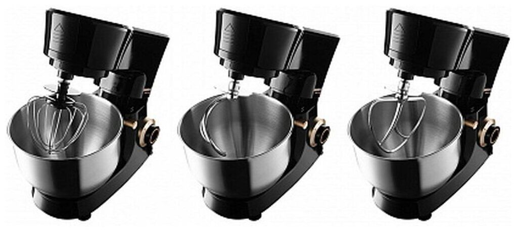 В комплектацию RKM-4045 входят 3 насадки для миксера: крюк для замеса вязкого дрожжевого теста, венчик для взбивания яиц, сливок, кремов и муссов, насадка-лопатка для смешивания кондитерской глазури и помадки, масляного или сырного крема.