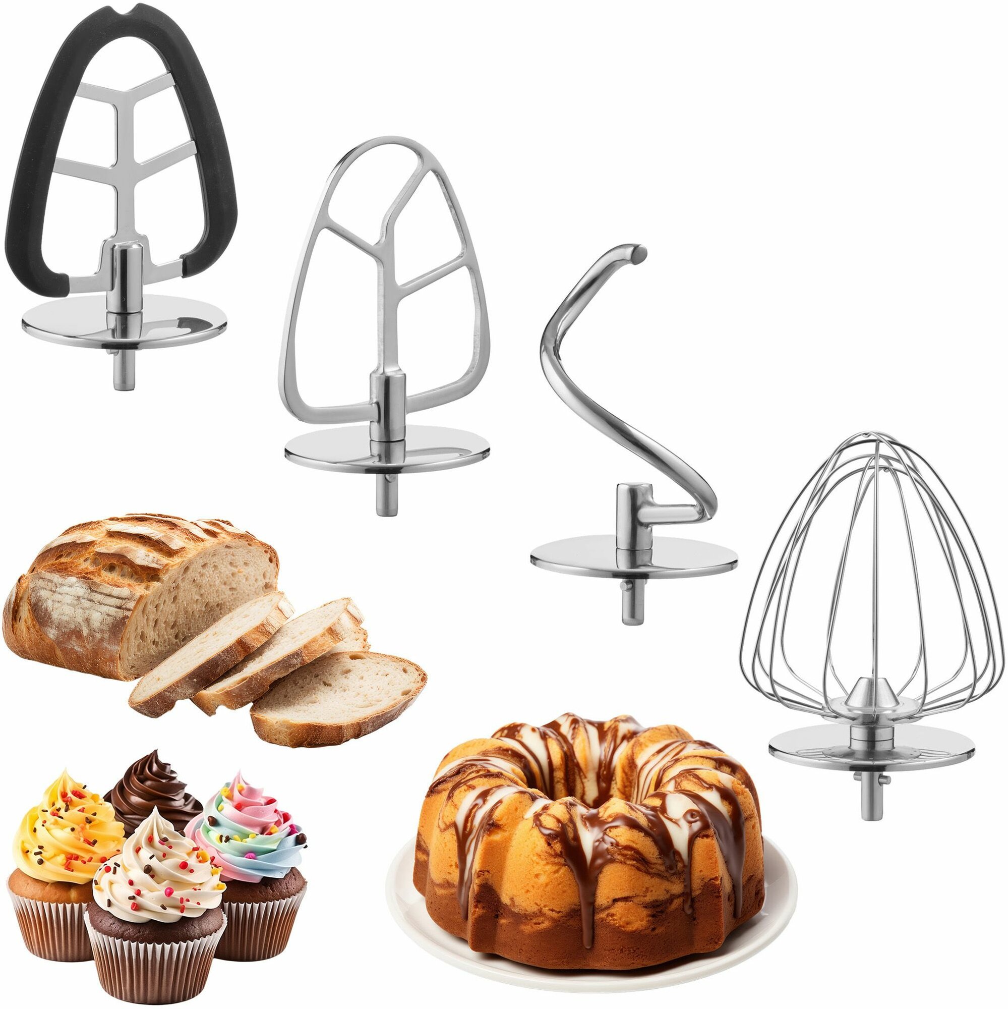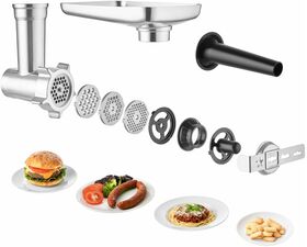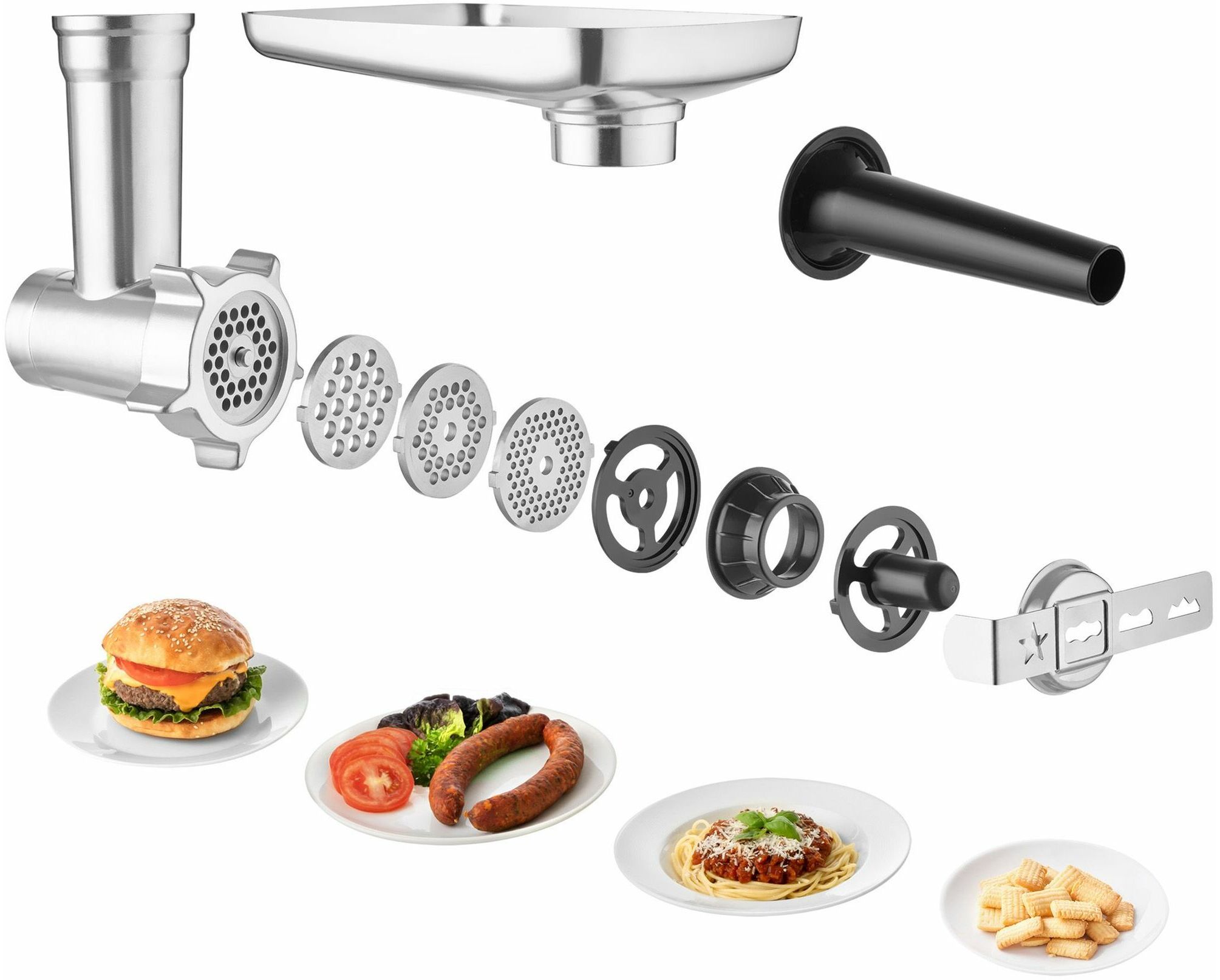 венчик для взбивания, биттер для перемешивания, силиконовый биттер, насадка / крюк для замеса теста, 3 диска для фарша, насадка для кеббе, насадка для домашних колбас, 4 насадки для нарезки/шинковки
