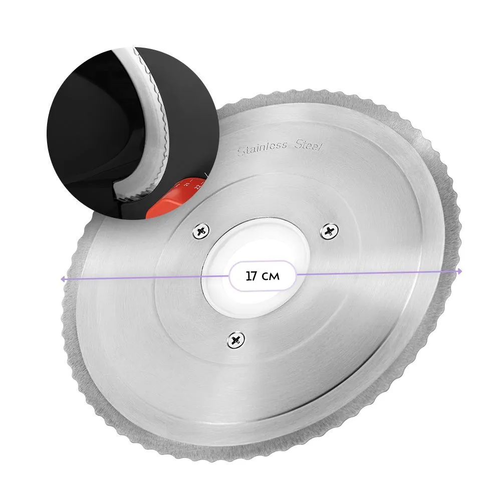 С помощью ломтерезки вы заметно сократите время нарезки и получите ровные ломтики, добиться которых обычным ножом очень непросто. Толщина нарезки определяется зазором между дисковым ножом и ограничителем. Толщину ломтиков можно регулировать от 1 до 22 мм
