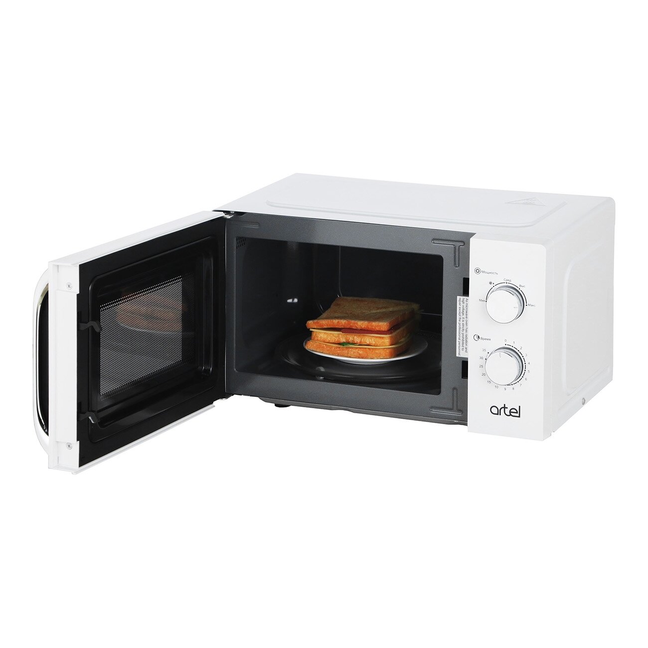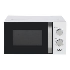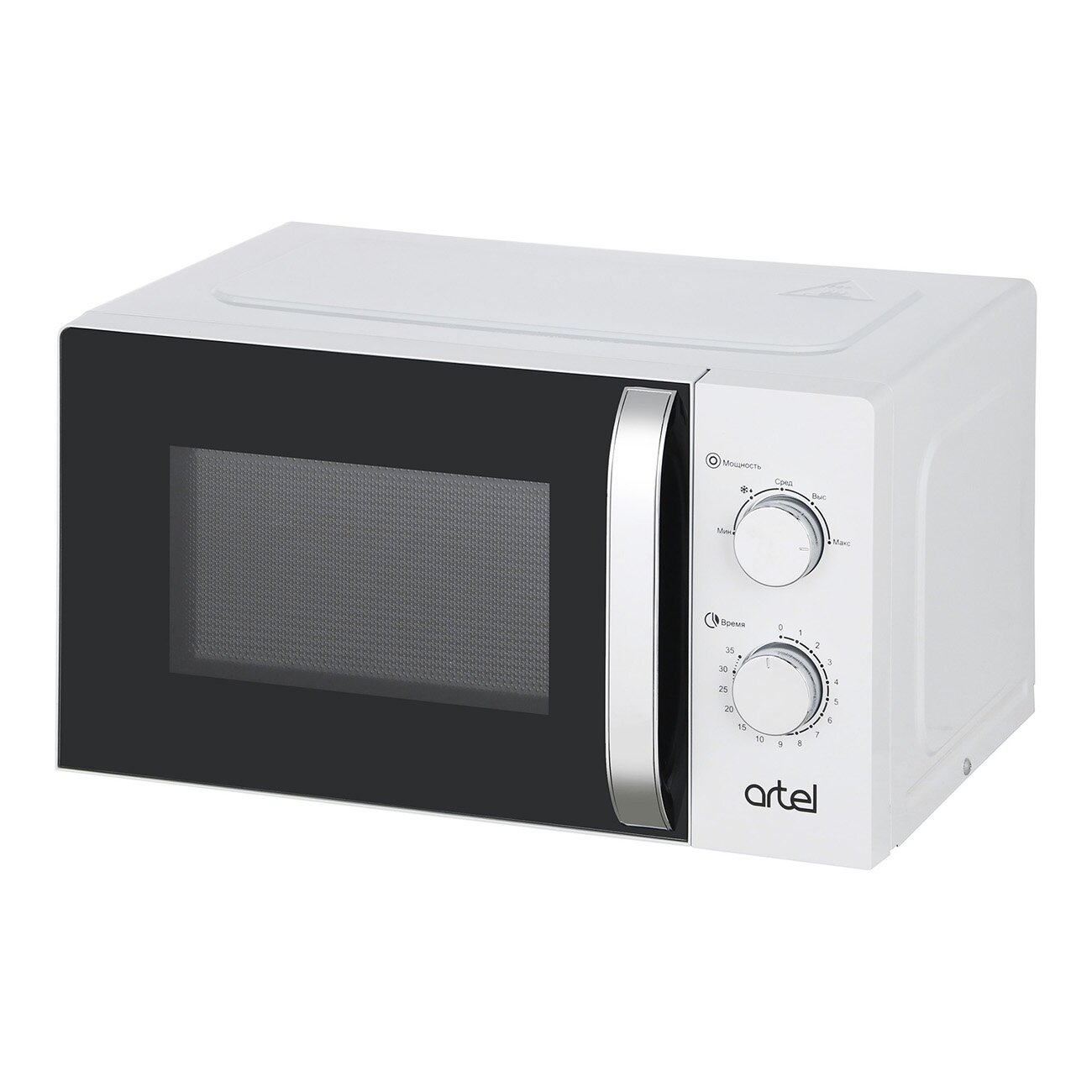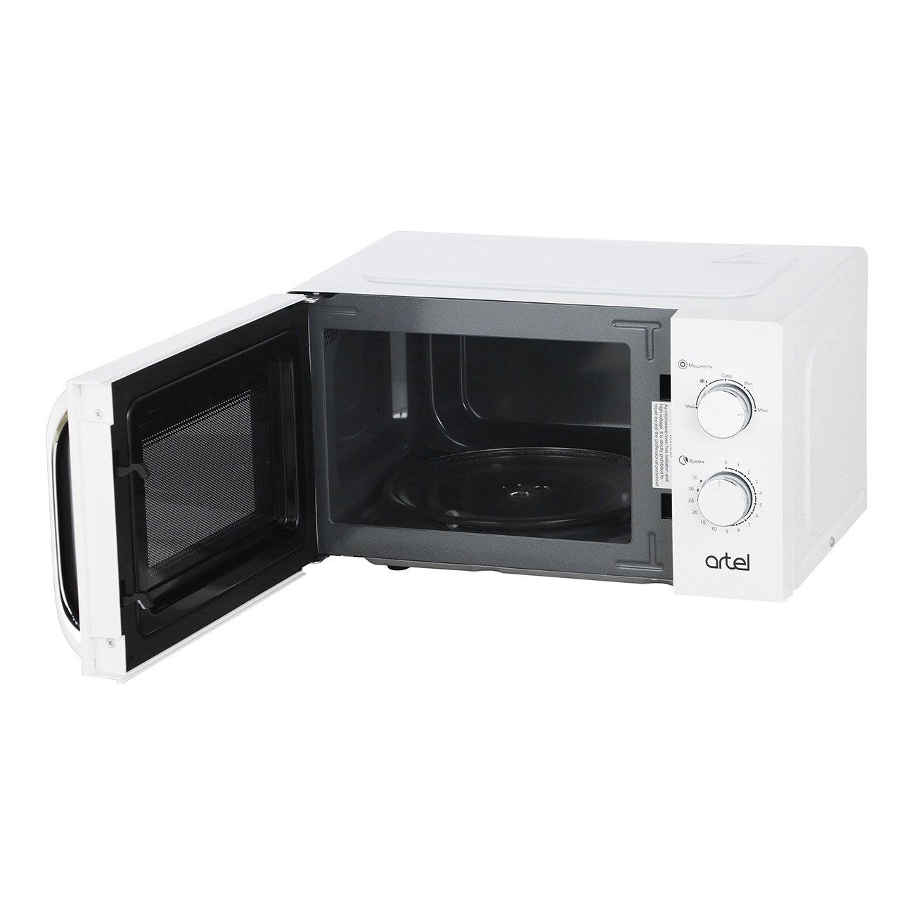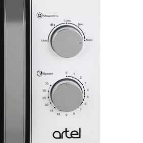 Микроволновая печь соло Artel ART-MWM2001 выполнена в корпусе белого цвета. Мощность регулируется на пяти уровнях, предусмотрена функция размораживания по весу. Присутствуют таймер отложенного старта и звуковой сигнал завершения работы. За управление отвечают механические поворотные переключатели. Фронтальная панель сделана из пластика. Дверца открывается при помощи ручки. Поворотный стол диаметром 25,5 см выполнен из стекла. Полезный объем камеры — 20 л. Мощность — 1100 Вт. Вес устройства — 10,5 кг.