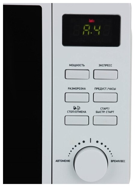 соло (без гриля и конвекции), объем 20 л, мощность микроволн 700 Вт, автоматические режимы: разморозка, разогрев, приготовление, размеры (ШxВxГ): 45.1x25.8x33.1 cм, цвет корпуса: белый
