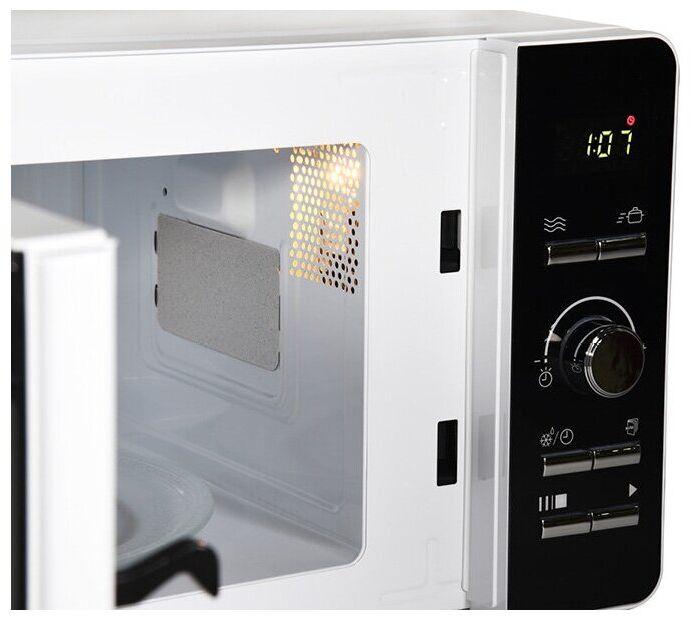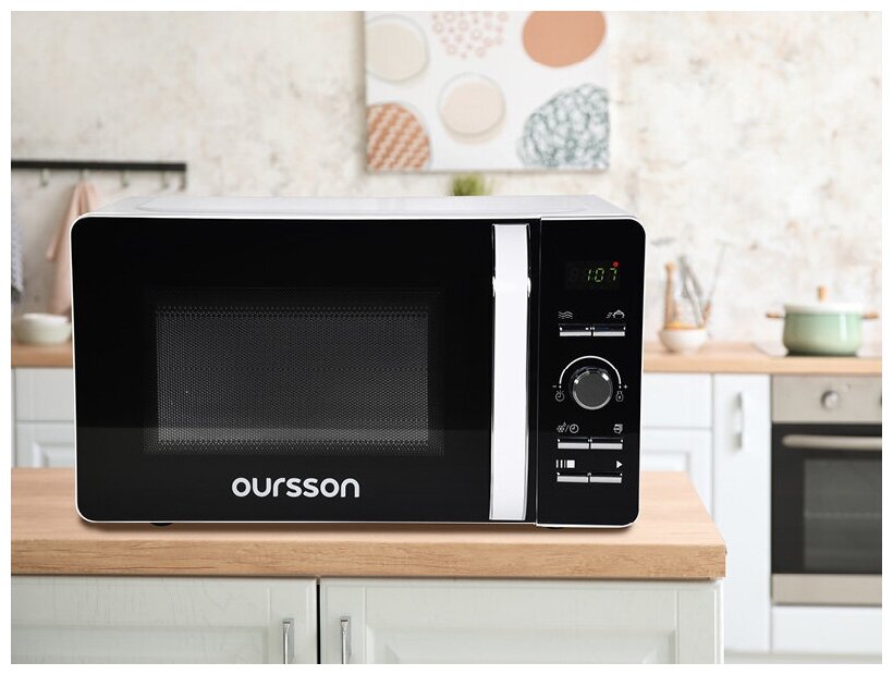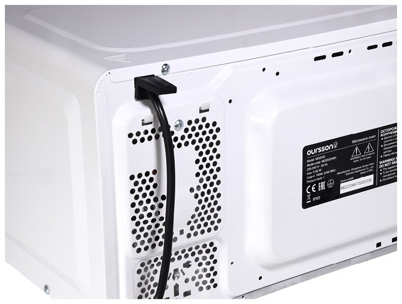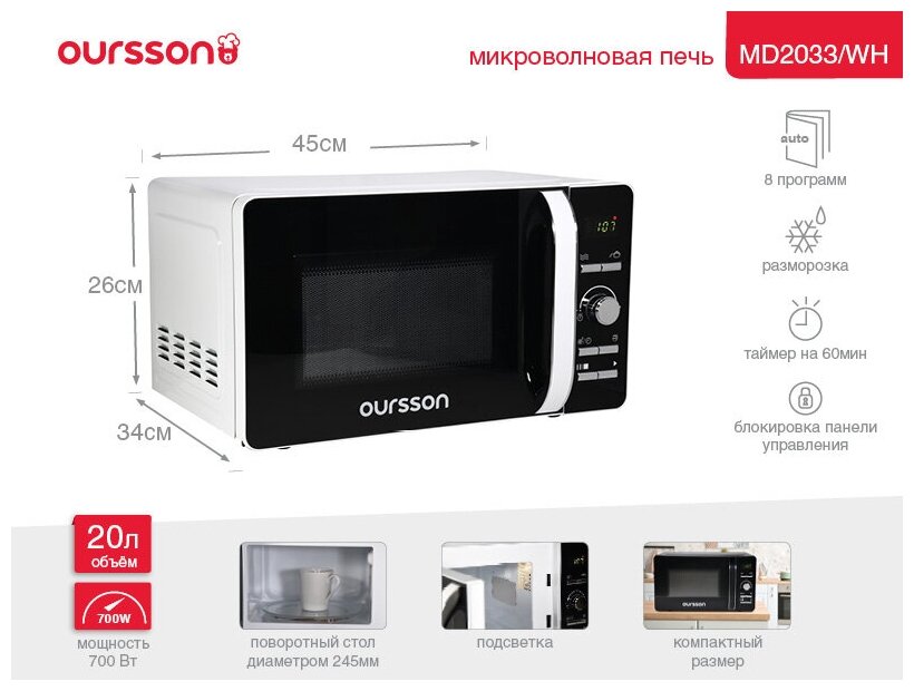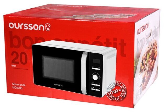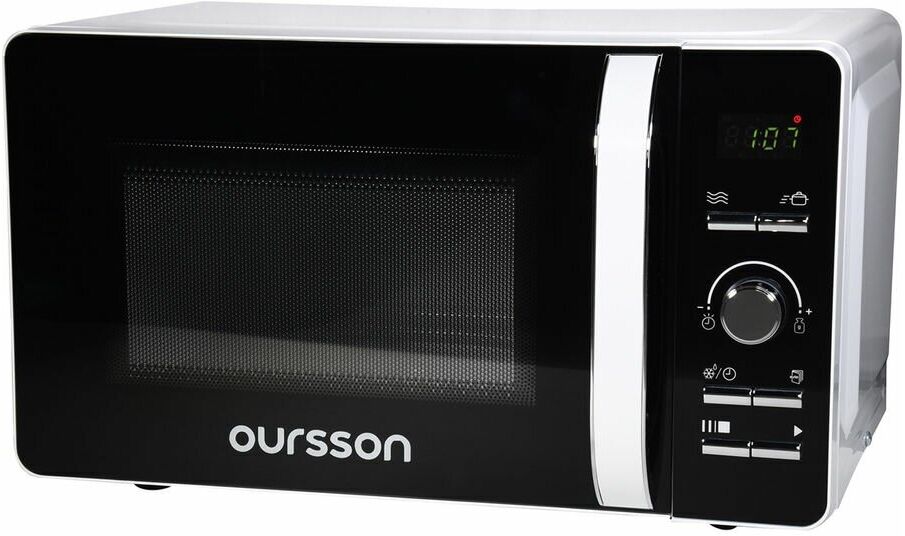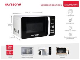 Микроволновая печь OURSSON MD2033/WH Белый с электронным управлением и внутренним объемом 20 литров оснащена LED-дисплеем с часами и таймером на 60 минут. Модель имеет 8 автоматических программ приготовления, функцию разморозки, регулировку уровней мощности, функцию «Быстрый старт», а также блокировку панели управление от детей. Максимальная мощность составляет 700Вт.