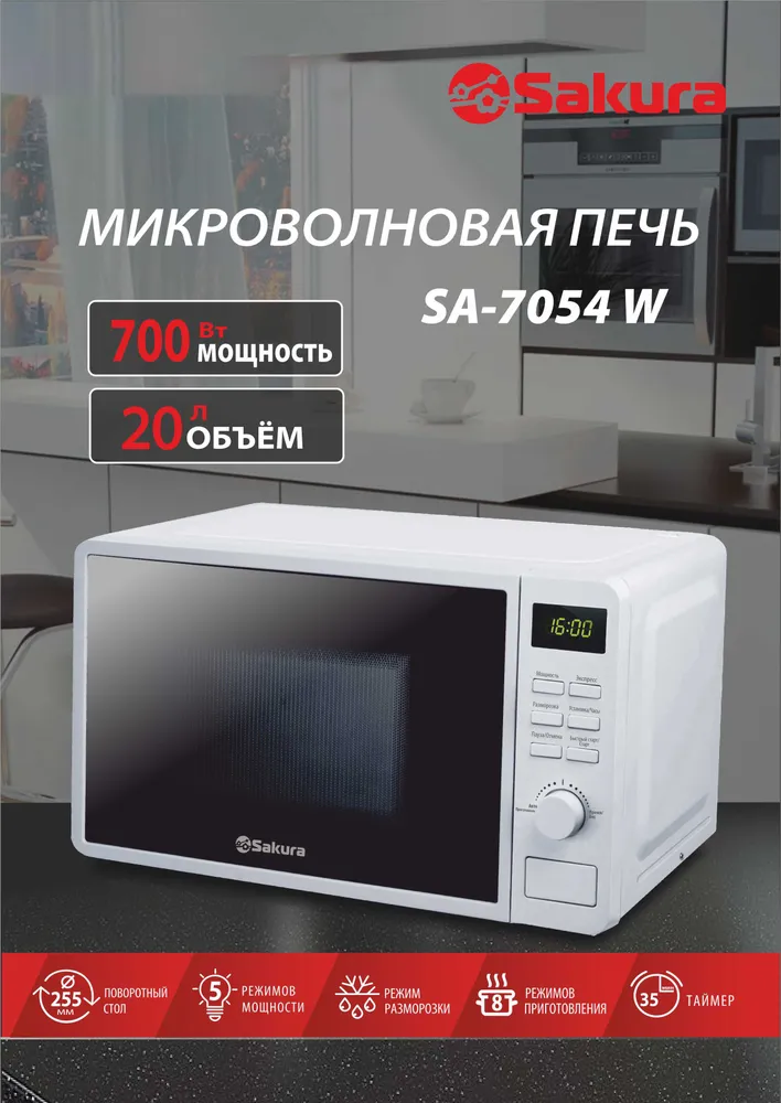 Особенности микроволновой печи: Дисплей, Внутреннее освещение, Поворотный стол, Регулировка температуры, Таймер, Часы