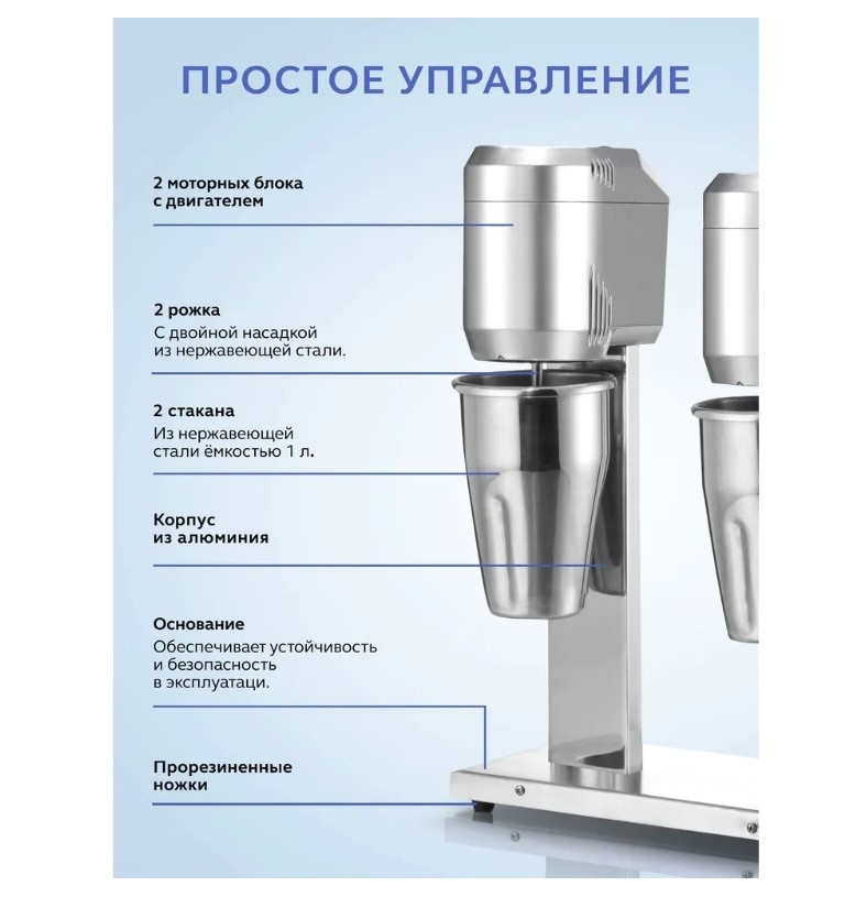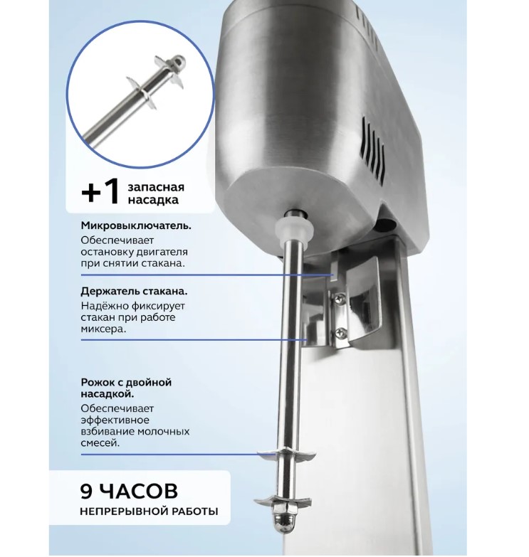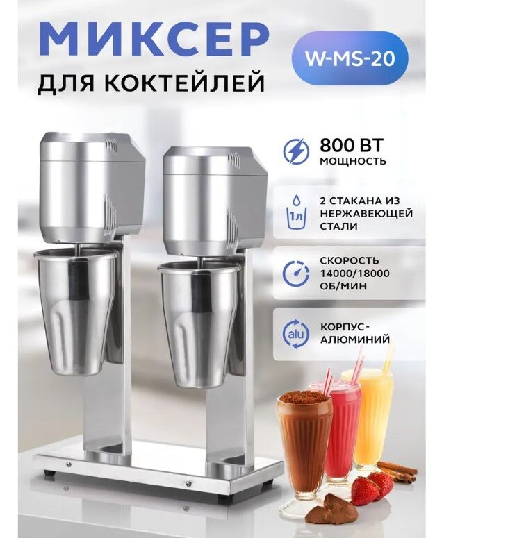 Двухрожковый миксер для молочных коктейлей Gastrorag W-MS-20 - это профессиональное оборудование для приготовления напитков в ресторанах, кафе, барах, которое также может быть использовано как техника для домашней кухни. Милкшейкер рассчитан на длительную непрерывную работу (до 9 часов) и предназначен для профессионалов коктейльного бизнеса. Барный миксер оснащен алюминиевым корпусом с массивным основанием на резиновых ножках-присосках, которые обеспечивают устойчивость и безопасность в эксплуатации. Устройство имеет две рабочих головки, что повышает пропускную способность и дает возможность одновременно готовить коктейли по разным рецептурам, с разными ингредиентами. Каждая рабочая головка имеет двухскоростной двигатель и простое электромеханическое управление с переключателем скоростей, расположенным в верхней части. На несъемном шпинделе крепится съемная насадка для взбивания из нержавеющей стали с двумя волнистыми дисками. В комплект также входит запасная насадка с крепежом. Благодаря мощному двигателю и высокой скорости вращения насадки (14000/18000 оборотов в минуту) молочная смесь быстро и равномерно взбивается по всему объему стакана. Время приготовления классического коктейля из молока, пломбира и сиропа - 45 секунд. Два стакана емкостью 1 л из нержавеющей стали позволяют одновременно приготовить 4-6 порций напитков.