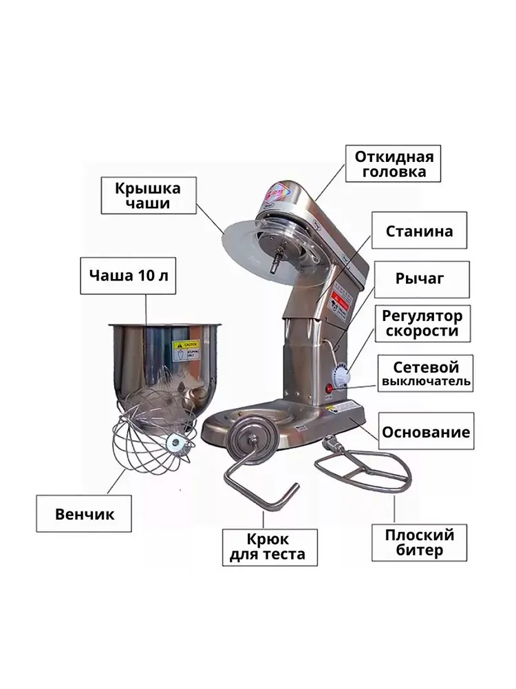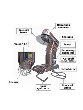 В комплект поставки входят 3 насадки – крюк для замешивания теста, плоский битер и проволочный венчик.