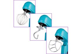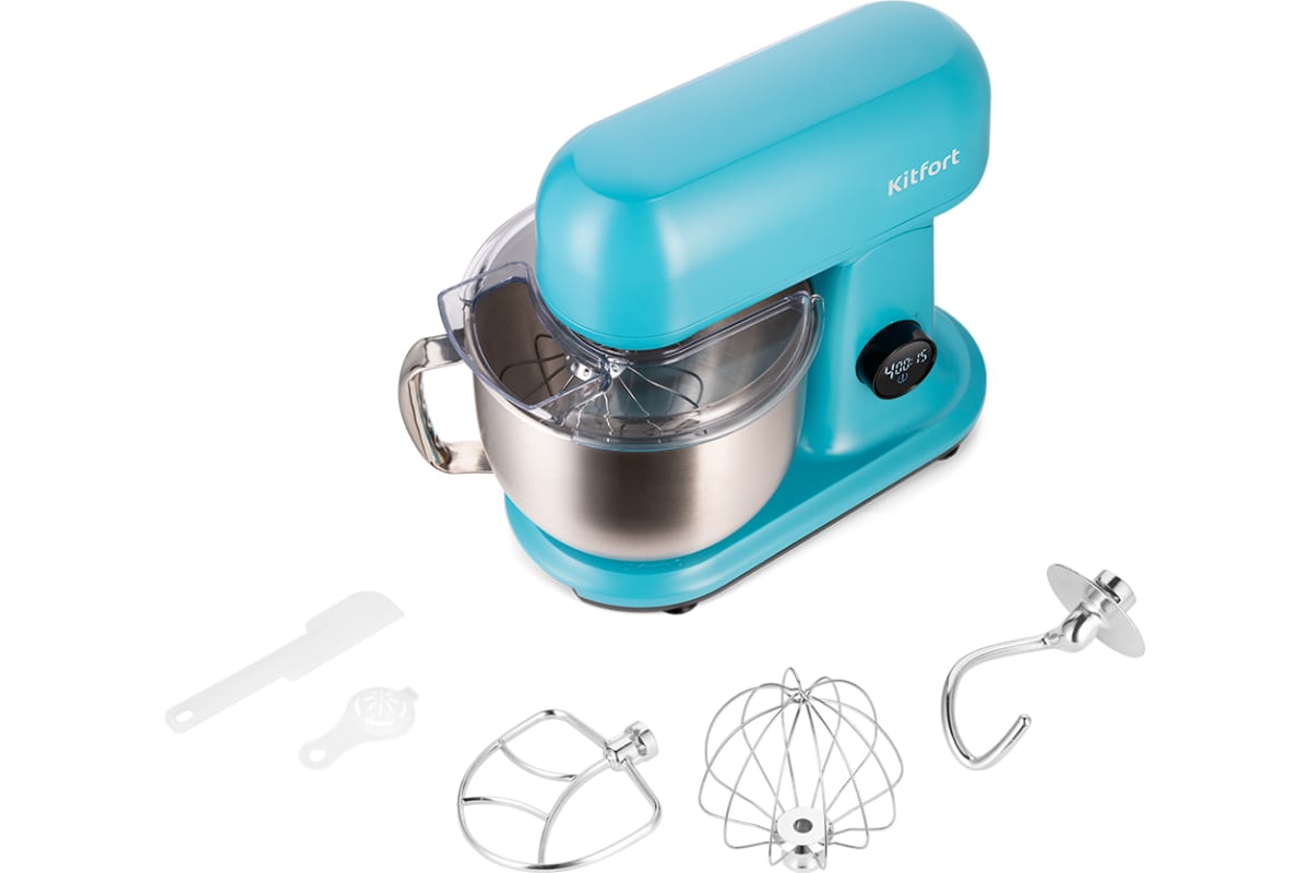 В комплекте идут венчик для взбивания, насадка для смешивания, крюк для замеса крутого теста, а также сепаратор для яиц и лопатка для ручного смешивания и вычищения остатков из чаши.