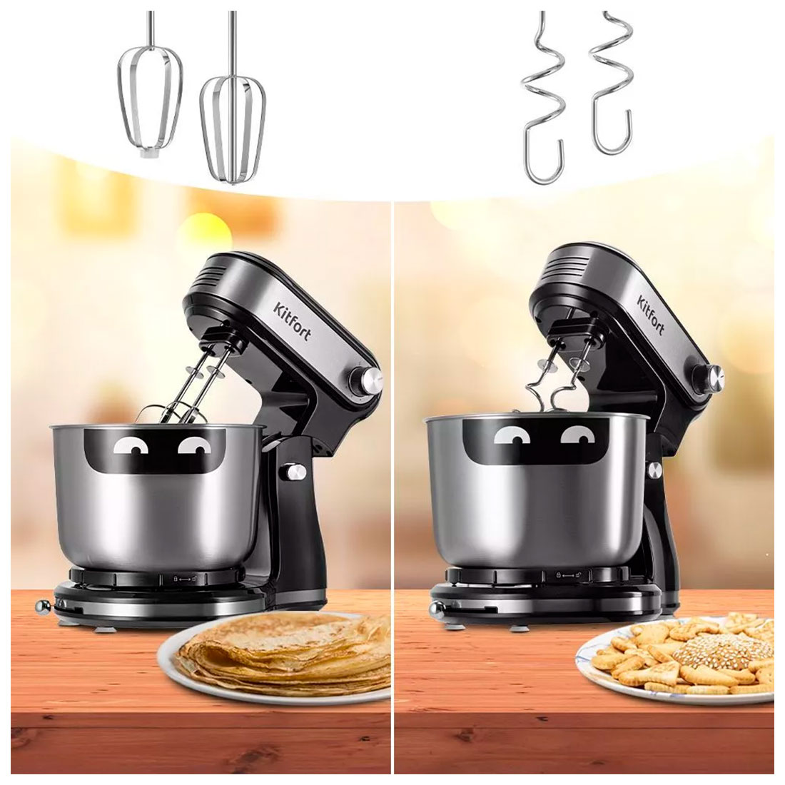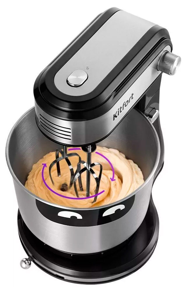 В комплекте идут 2 вида насадок: венчики для взбивания и замешивания жидкого теста для блинов, бисквитов и крюки - для замешивания более плотного теста, например, песочного или дрожжевого. Вставка на венчике касается дна чаши, за счёт чего чаша крутится.