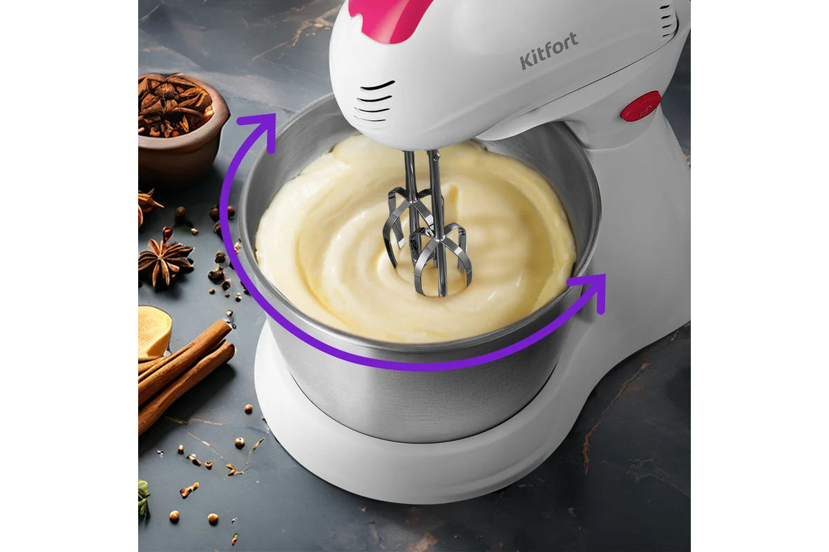 Во время работы насадки вращаются вокруг своей оси, а чашу можно вращать вручную, чтобы ингредиенты смешивались без комочков. Миксер может работать и в полностью автоматическом режиме без вращения чаши. Вам достаточно только установить насадки, положить ингредиенты в чашу и включить прибор. Это освободит вас от участия в процессе взбивания и перемешивания, а также позволит добавлять ингредиенты в чашу прямо в процессе смешивания. При этом КТ-3485 легко превращается в обычный ручной миксер, если снять его с подставки.