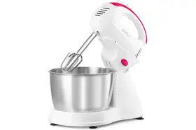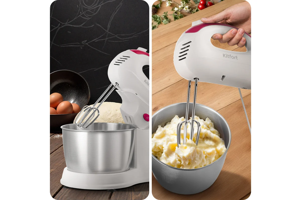 Миксер «2 в 1» КТ-3485 совмещает в себе ручной миксер и стационарный миксер с чашей. Он поможет вам взбить яичные белки, приготовить кремы, домашние соусы, а также жидкое тесто, например, для шарлотки, или густое — для сдобной выпечки. Миксер подходит для замешивания легких и плотных смесей, но не для замеса тугого теста, например, для пельменей.
