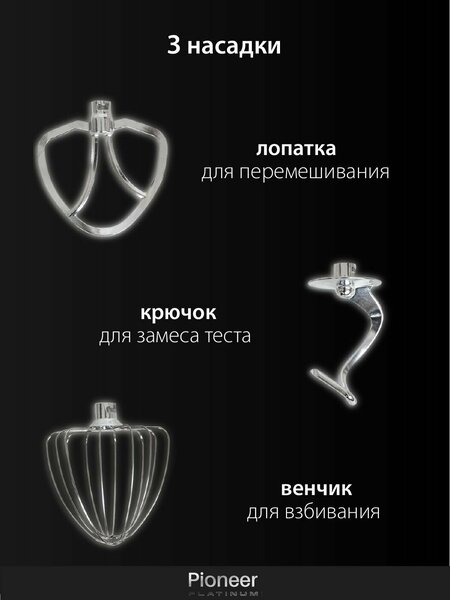 венчик для взбивания, защитная крышка, насадка-крюк, насадка для перемешивания, чаша