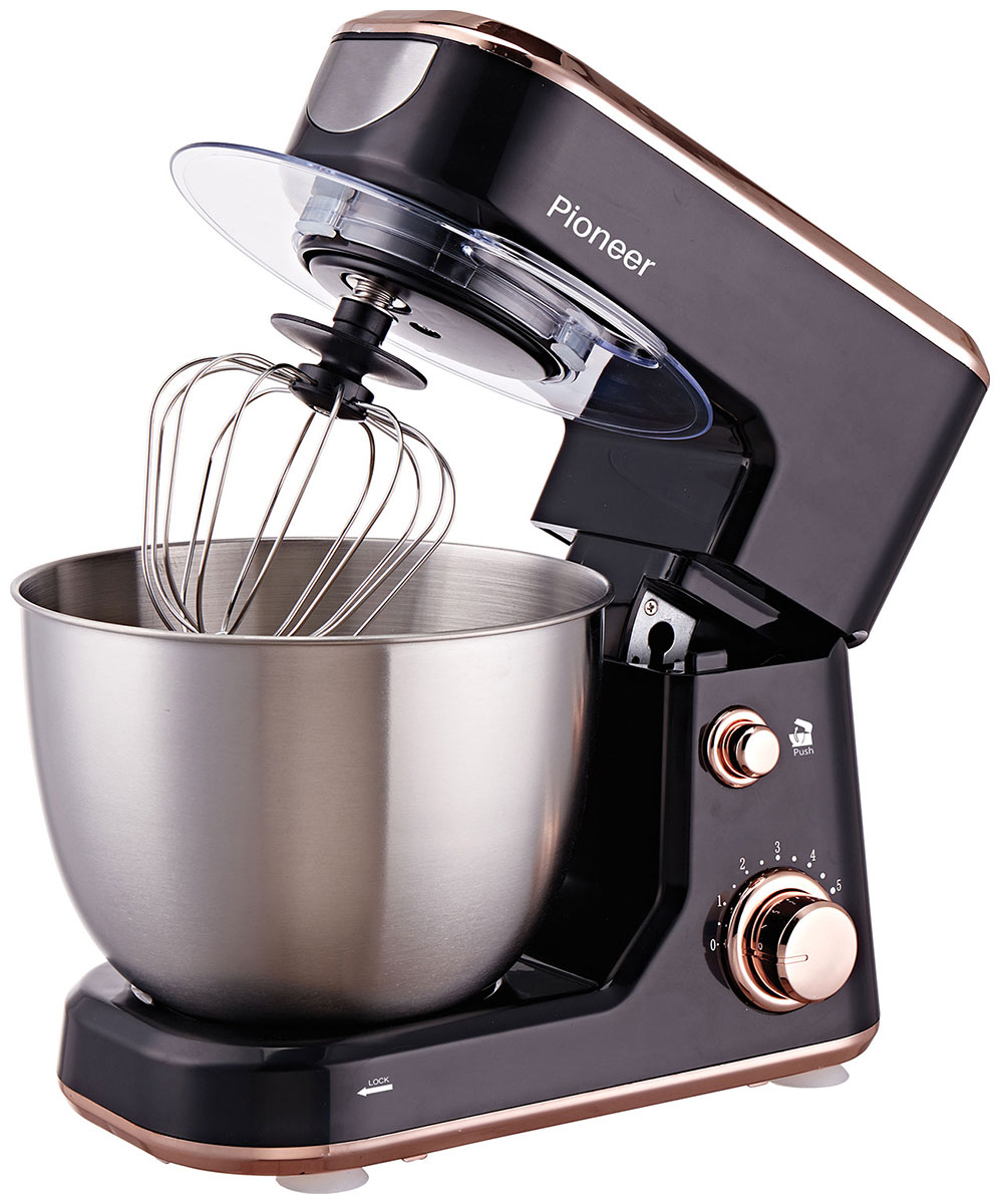 Миксер, чаша из нержавеющей стали, крышка чаши, крючок для замеса теста, лопатка для перемешивания, венчик для взбивания, лопатка, инструкция на русском языке