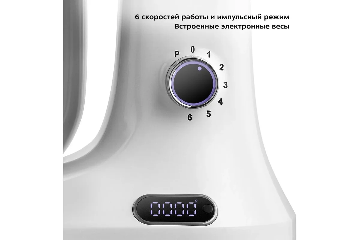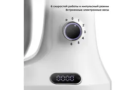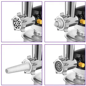 встроенные весы, 2 терки, 3 перфорированных диска для фарша, насадки для приготовления колбас и кеббе, насадка-мясорубка
