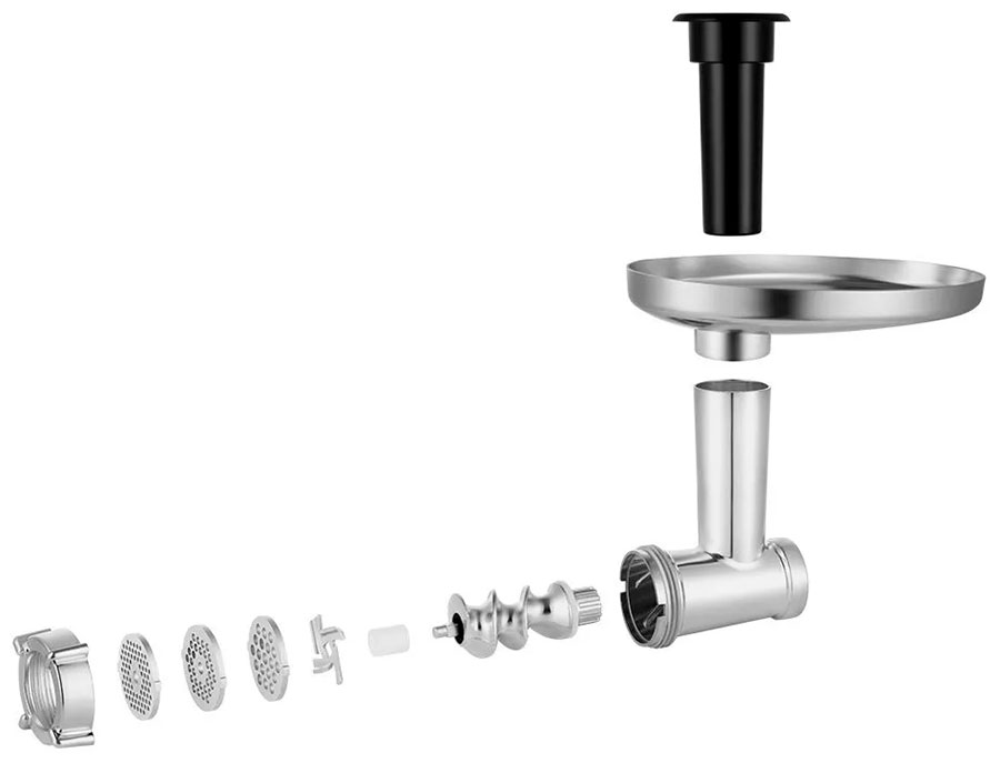 Для мясорубки предусмотрены загрузочный лоток с толкателем, чтобы удобно и безопасно подавать продукты в загрузочный блок. Все составные части мясорубки легко мыть и чистить.
