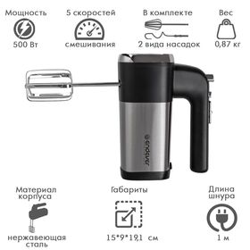 5 скоростей смешивания, Режим TURBO, Прочный корпус с удобной эргономичной ручкой, 2 комплекта насадок, Кнопка высвобождения насадок, Материал: нержавеющая сталь